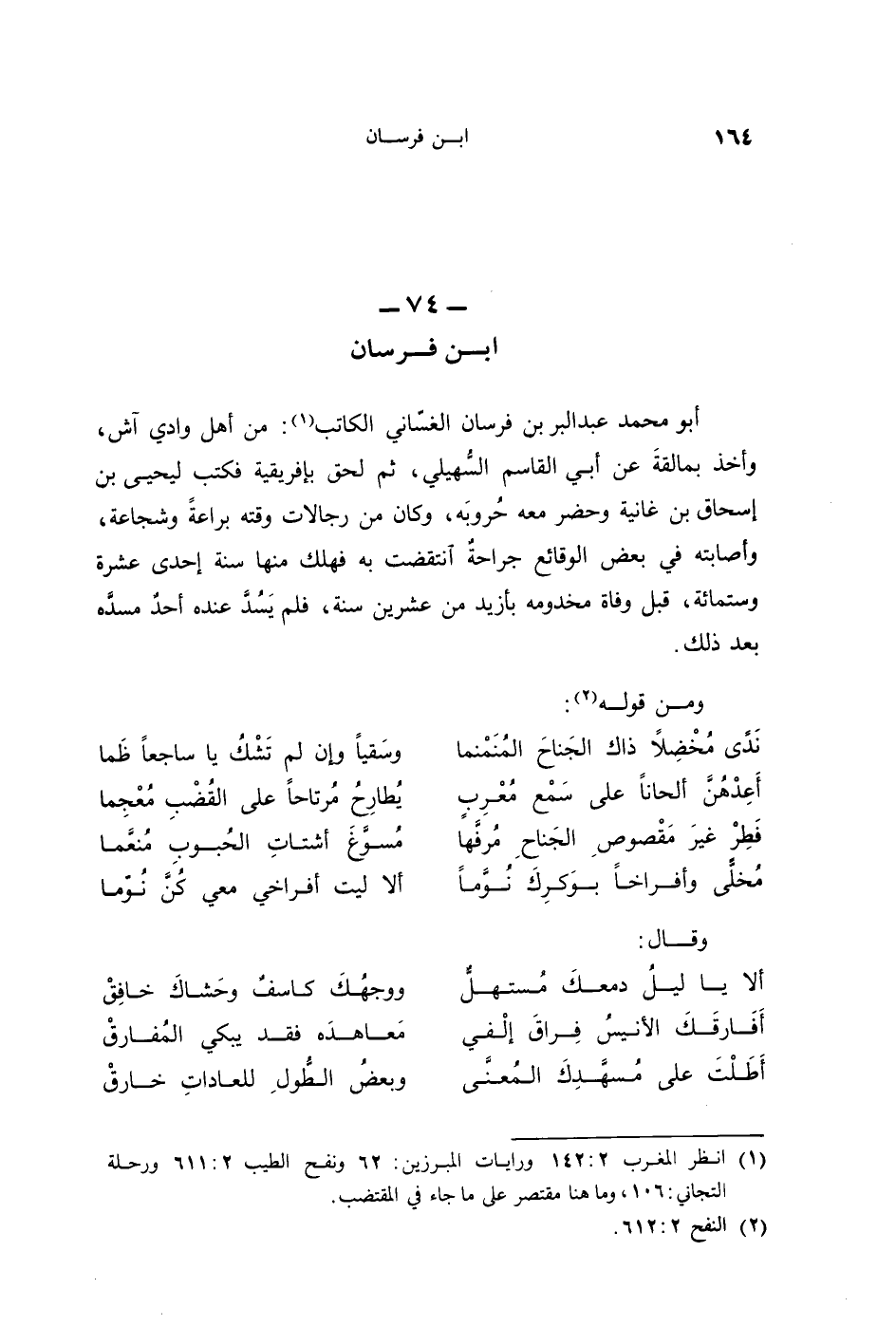 أبو محمد عبد البر بن فرسان الغسّاني الكاتب: من أهل وادي آش، وأخذ بمالقة عن أبي القاسم السُّهيلي، ثمَّ لحق بإفريقية فكتب ليحيى بن إسحاق بن غانية وحضر معه حروبه، وكان من رجالات وقته براعةً وشجاعة، وأصابته في بعض الوقائع جراحةٌ انتقضت به فهلك منها سنة إحدى عشرة وستمائة، قبل وفاة مخدومه بأزيد من عشرين سنة، فلم يسُدَّ عنده أحدٌ مسدَّه بعد ذلك.