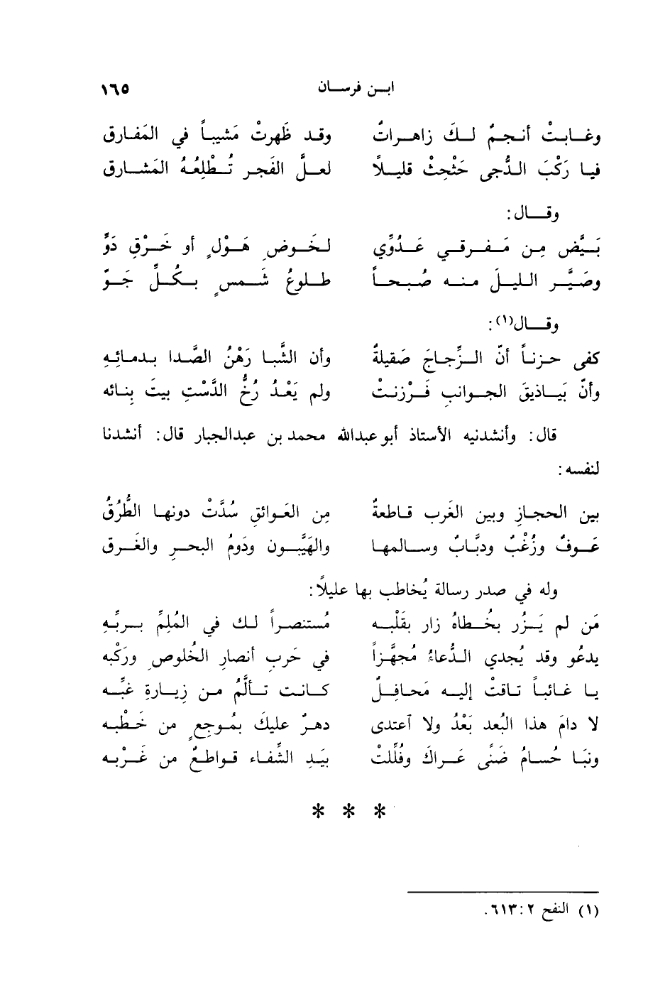 قال: وأنشدنيه الأستاذ أبو عبد الله محمد بن عبد الجبار قال: أنشدنا لنفسه: