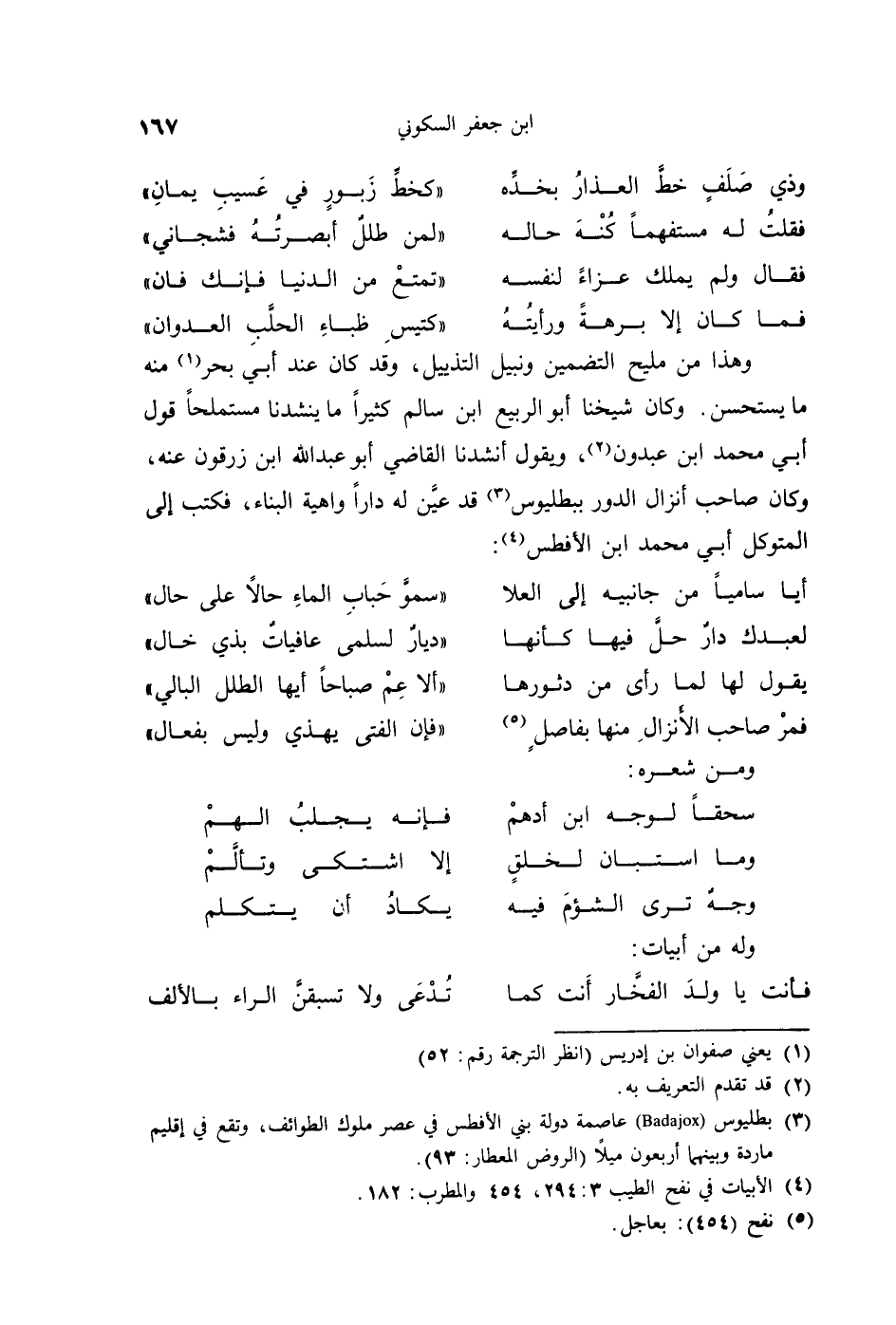 وهذا من مليح التضمين ونبيل التذييل، وقد كان عند أبي بحر منه ما يستحسن. وكان شيخنا أبو الرَّبيع ابن سالم كثيراً ما ينشدنا مستملحاً قول أبي محمد ابن عبدون، ويقول أنشدنا القاضي أبو عبد الله ابن زرقون عنه، وكان صاحب أنزال الدور ببطليوس قد عيَّن له داراً واهية البناء، فكتب إلى المتوكل أبي محمد ابن الأفطس: