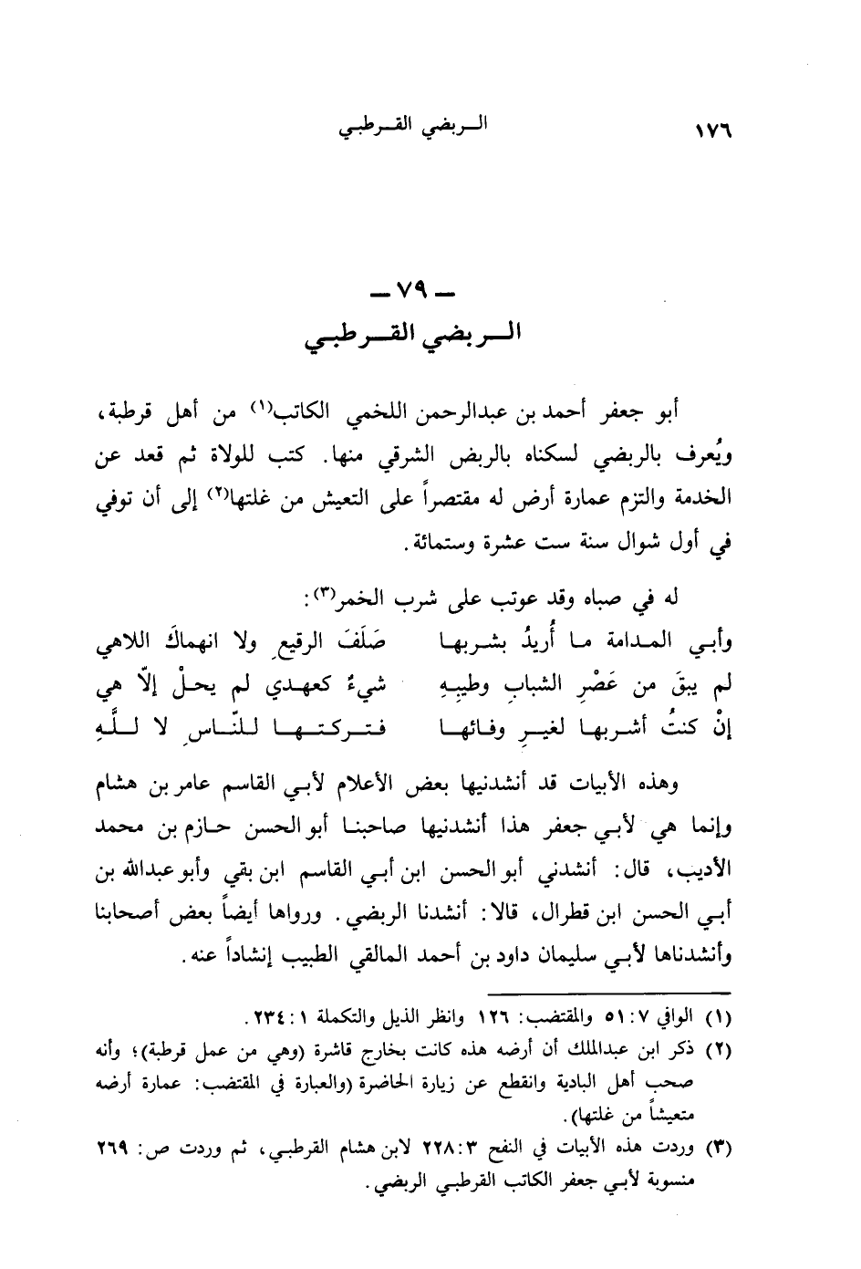 وهذه الأبيات قد أنشدنيها بعض الأعلام لأبي القاسم عامر بن هشام وإنَّما هي لأبي جعفر هذا أنشدنيها صاحبنا أبو الحسن حازم بن محمد الأديب، قال: أنشدني أبو الحسن ابن أبي القاسم ابن بقي وأبو عبد الله بن أبي الحسن ابن قطرال، قالا: أنشدنا الربضي. ورواها أيضاً بعض أصحابنا وأنشدناها لأبي سليمان داود بن أحمد المالقي الطبيب إنشاداً عنه.