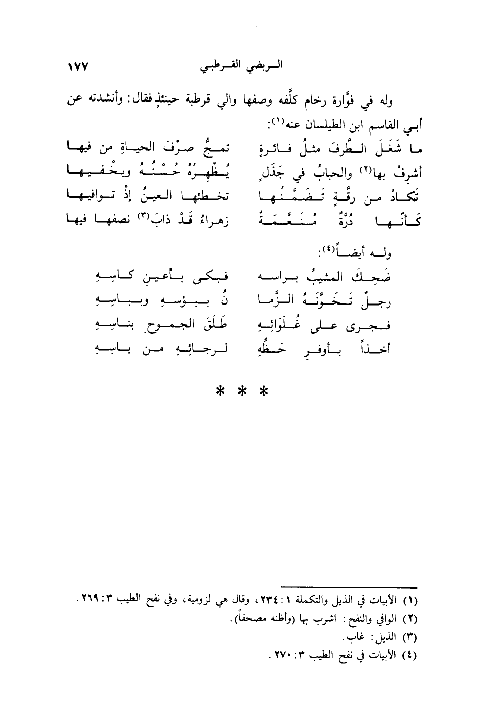 وله في فوَّارة رخام كلَّفه وصفها والي قُرْطُبَة حينئذٍ فقال: وأنشدته عن أبي القاسم ابن الطيلسان عنه: