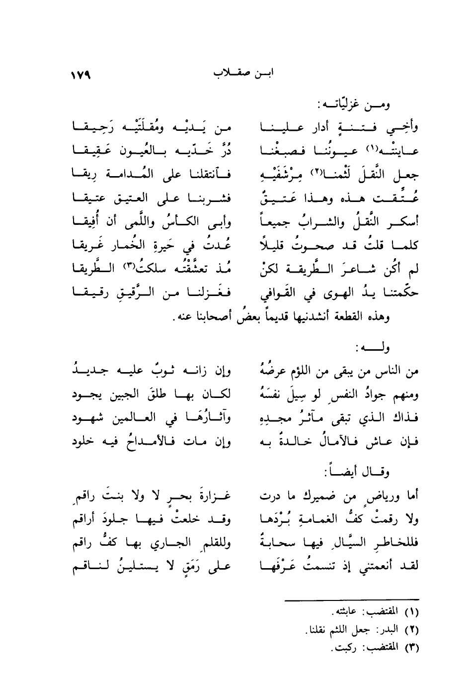 وهذه القطعة أنشدنيها قديماً بعض أصحابنا عنه: وله: