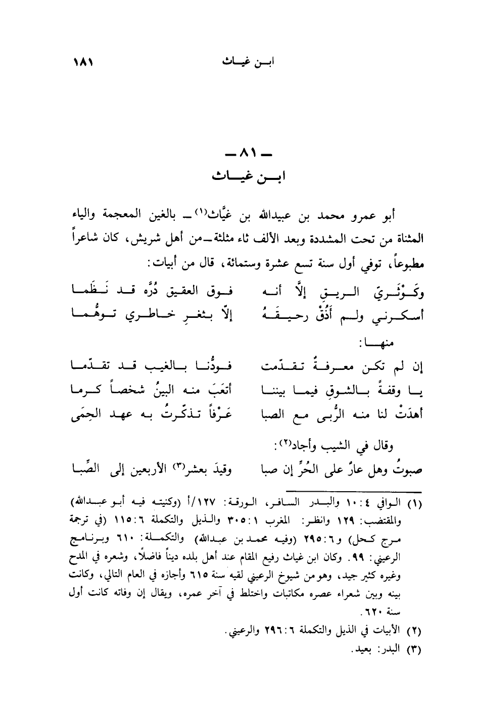 أبو عمرو محمد بن عبيد الله بن غيَّاث - بالغين المعجمة والياء المثناة من تحت المشددة وبعد الألف ثاء مثلثة - من أهل شريش، كان شاعراً مطبوعاً، توفي أول سنة تسع عشرة وستمائة، قال من أبيات: