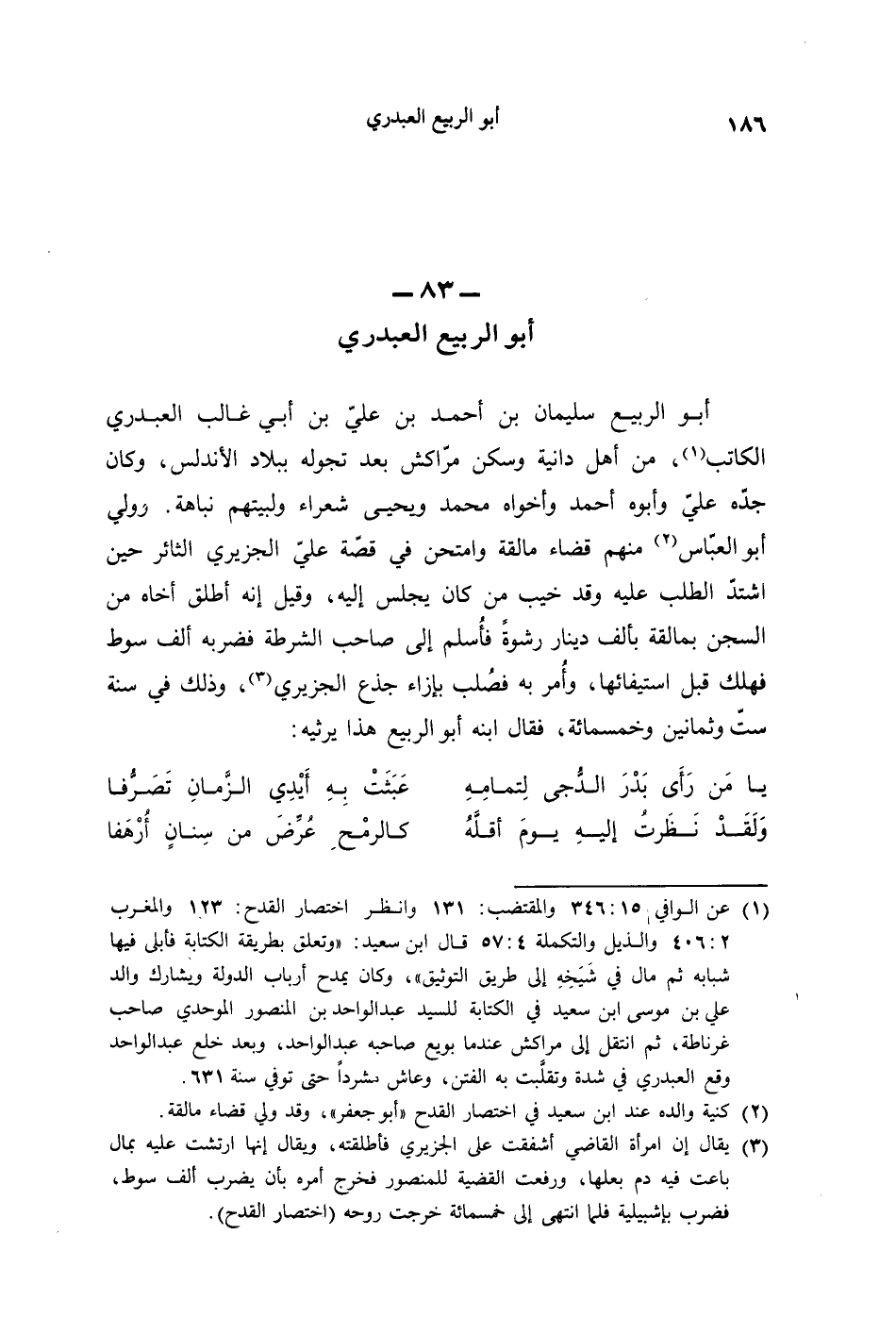 أبو الرَّبيع سليمان بن أحمد بن عليّ بن أبي غالب العبدري الكاتب، من أهل دانية وسكن مرّاكش بعد تجوله ببلاد الأندلس، وكان جدّه عليّ وأبوه أحمد وأخواه محمد ويحيى شعراء ولبيتهم نباهة. وولي أبو العباس منهم قضاء مالقة وامتحن في قصّة عليّ الجزيري الثائر حين اشتدّ الطلب عليه وقد خيب من كان يجلس إليه، وقيل إنَّه أطلق أخاه من السجن بمالقة بألف دينار رشوةً فأُسلم إلى صاحب الشرطة فضربه ألف سوط فهلك قبل استيفائها، وأُمر به فصُلب بإزاء جذع الجزيري، وذلك في سنة ستّ وثمانين وخمسمائة، فقال ابنه أبو الرَّبيع هذا يرثيه: