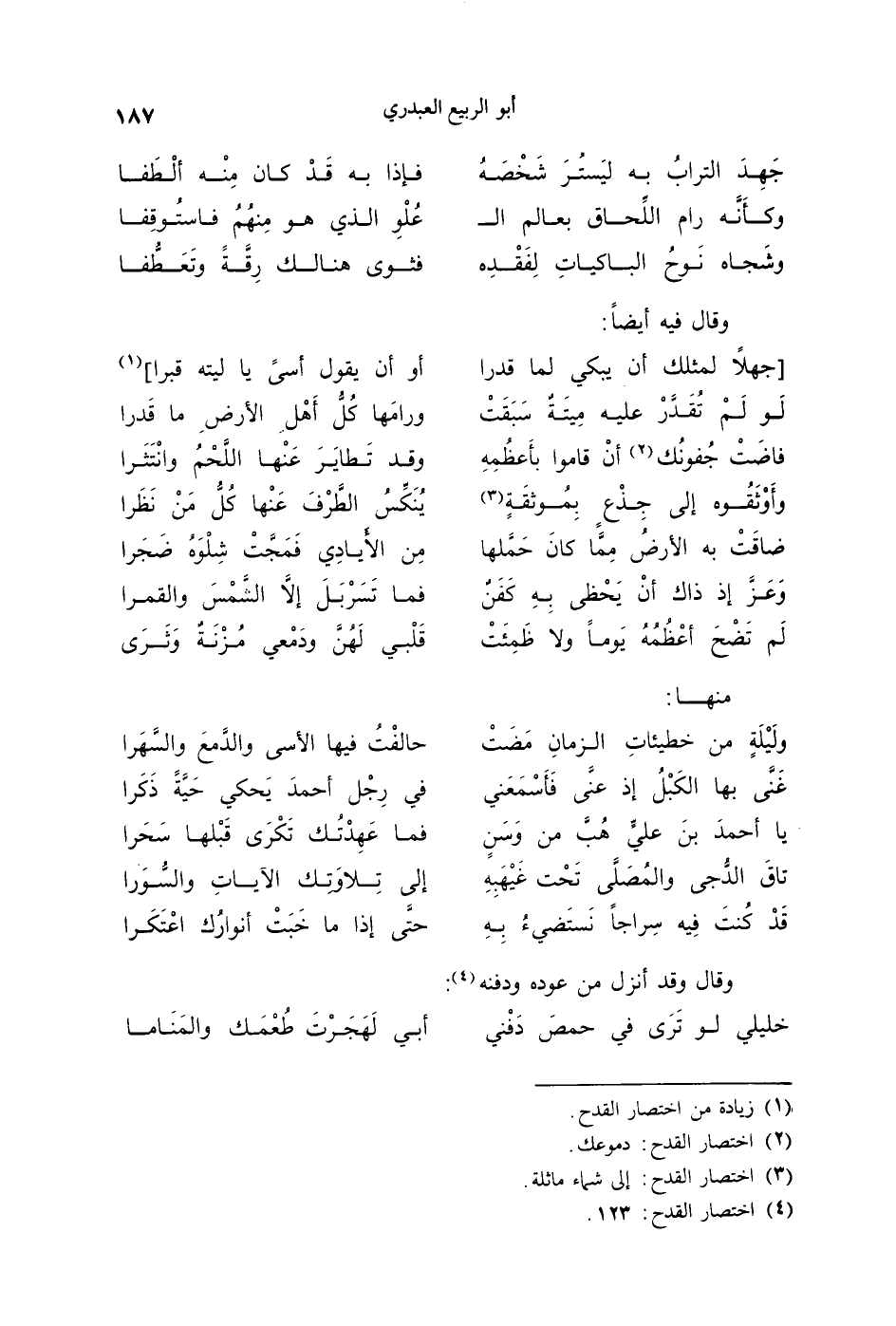 فاضَتْ جُفونُك أن قاموا بأعظُمهِ ... وقد تطايرَ عنها اللَّحْمُ وانْتَثرا