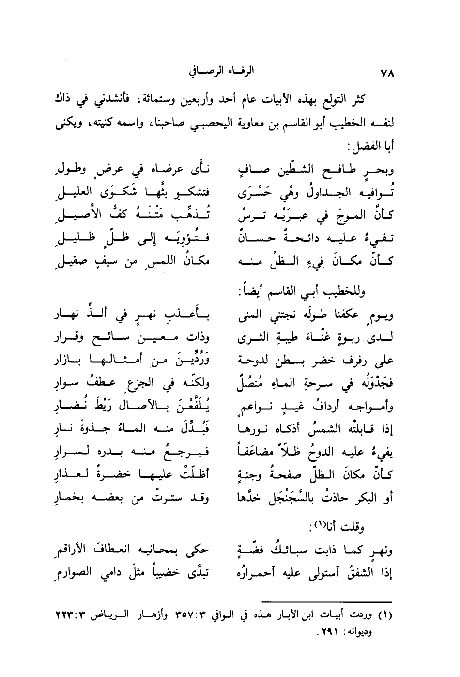 ونهرٍ كما ذابت سبائكُ فضَّةٍ ... حكى بمحانيه انعطافَ الأراقمِ