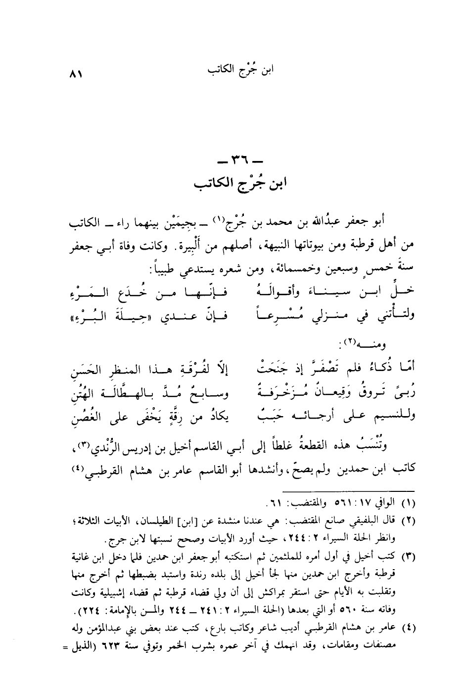 أبو جعفر عبد الله بن محمد بن جُرْج - بجيمين بينهما راء - الكاتب من أهل قُرْطُبَة ومن بيوتاتها النبيهة، أصلهم من أَلْبِيرة. وكانت وفاة أبي جعفر سنة خمس وسبعين وخمسمائة، ومن شعره يستدعي طبيباً: