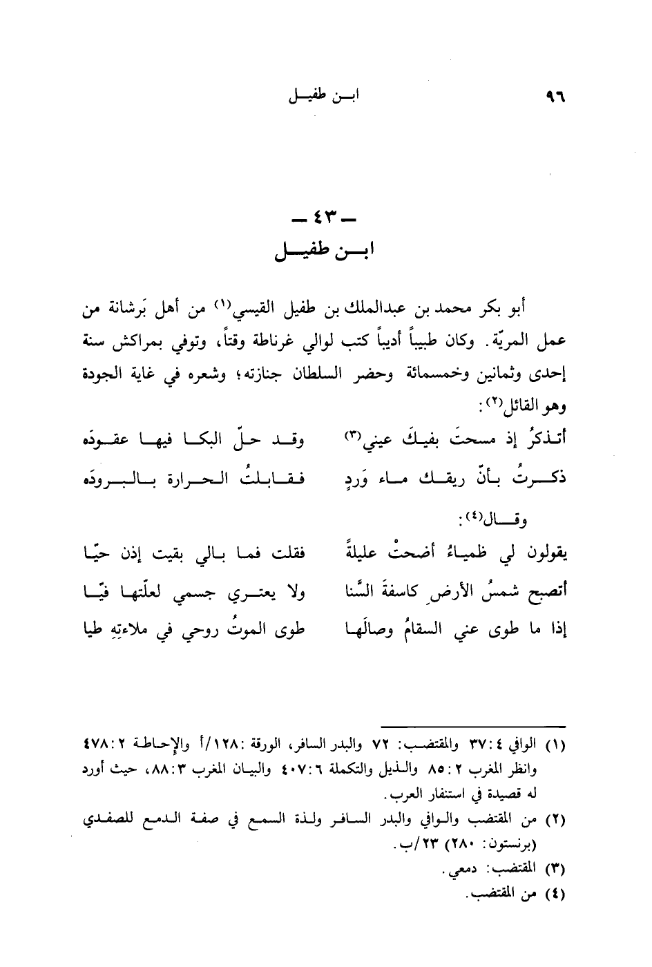 أبو بكر محمد بن عبد الملك بن طفيل القيسي، من أهل بَرشانة من عمل المريّة. وكان طبيباً أديباً كتب لوالي غرناطة وقتاً، وتوفي بمراكش سنة إحدى وثمانين وخمسمائة وحضر السلطان جنازته؛ وشعره في غاية الجودة وهو القائل: