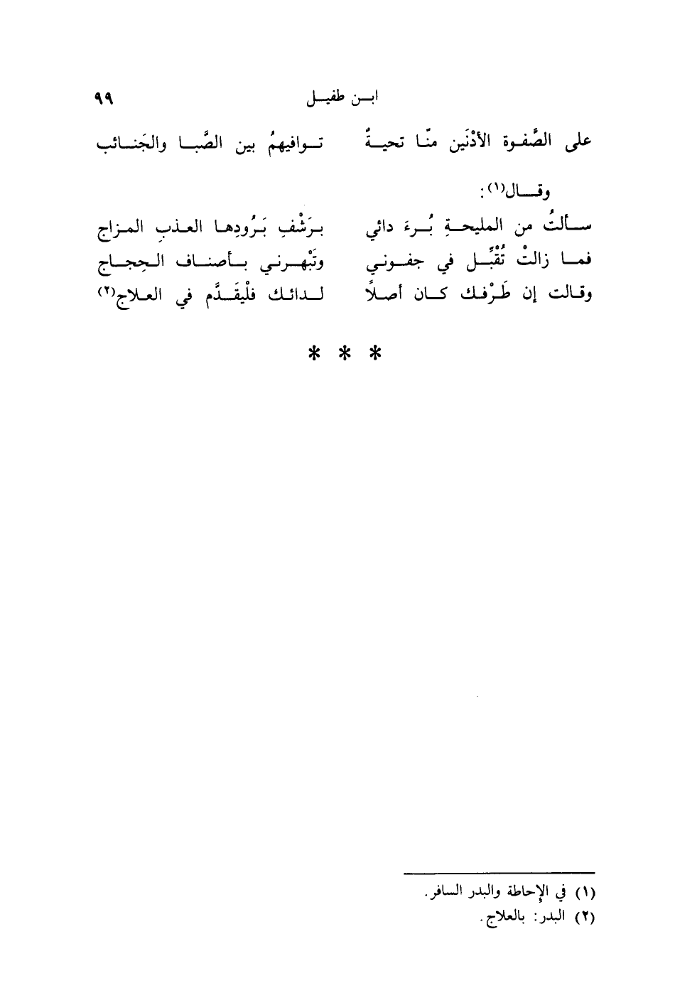 سألتُ من المليحةِ بُرءَ دائي ... برَشْفِ بَرُودِها العذبِ المزاج