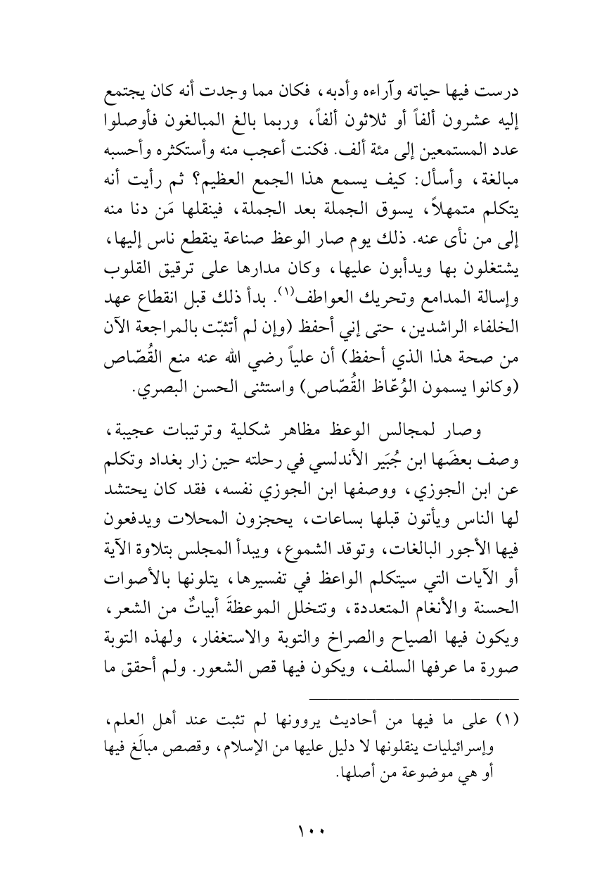 درست فيها حياته وآراءه وأدبه، فكان مما وجدت أنه كان يجتمع إليه عشرون ألفاً أو ثلاثون ألفاً، وربما بالغ المبالغون فأوصلوا عدد المستمعين إلى مئة ألف. فكنت أعجب منه وأستكثره وأحسبه مبالغة، وأسأل: كيف يسمع هذا الجمع العظيم؟ ثم رأيت أنه يتكلم متمهلاً، يسوق الجملة بعد الجملة، فينقلها مَن دنا منه إلى من نأى عنه. ذلك يوم صار الوعظ صناعة ينقطع ناس إليها، يشتغلون بها ويدأبون عليها، وكان مدارها على ترقيق القلوب وإسالة المدامع وتحريك العواطف (¬1). بدأ ذلك قبل انقطاع عهد الخلفاء الراشدين، حتى إني أحفظ (وإن لم أتثبّت بالمراجعة الآن من صحة هذا الذي أحفظ) أن علياً رضي الله عنه منع القُصّاص (وكانوا يسمون الوُعّاظ القُصّاص) واستثنى الحسن البصري.