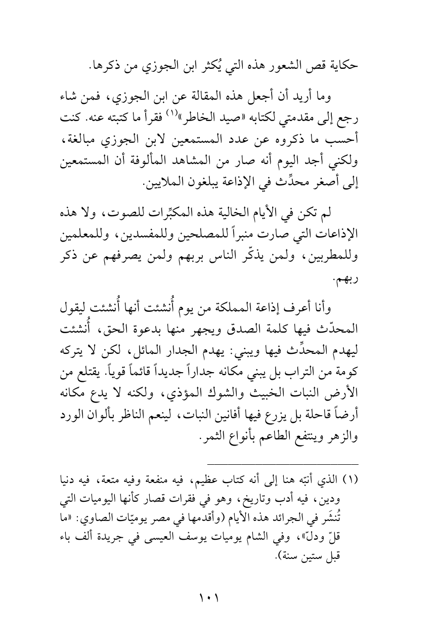 وما أريد أن أجعل هذه المقالة عن ابن الجوزي، فمن شاء رجع إلى مقدمتي لكتابه «صيد الخاطر» (¬1) فقرأ ما كتبته عنه. كنت أحسب ما ذكروه عن عدد المستمعين لابن الجوزي مبالغة، ولكني أجد اليوم أنه صار من المشاهد المألوفة أن المستمعين إلى أصغر محدِّث في الإذاعة يبلغون الملايين.