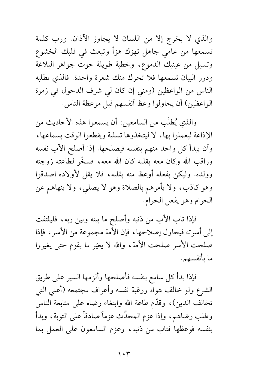 فإذا بدأ كل سامع بنفسه فأصلحها وألزمها السير على طريق الشرع ولو خالف هواه ورغبة نفسه وأعراف مجتمعه (أعني التي تخالف الدين)، وقدّم طاعة الله وابتغاء رضاه على متابعة الناس وطلب رضاهم، وإذا عزم المحدِّث عزماً صادقاً على التوبة، وبدأ بنفسه فوعظها فتاب من ذنبه، وعزم السامعون على العمل بما