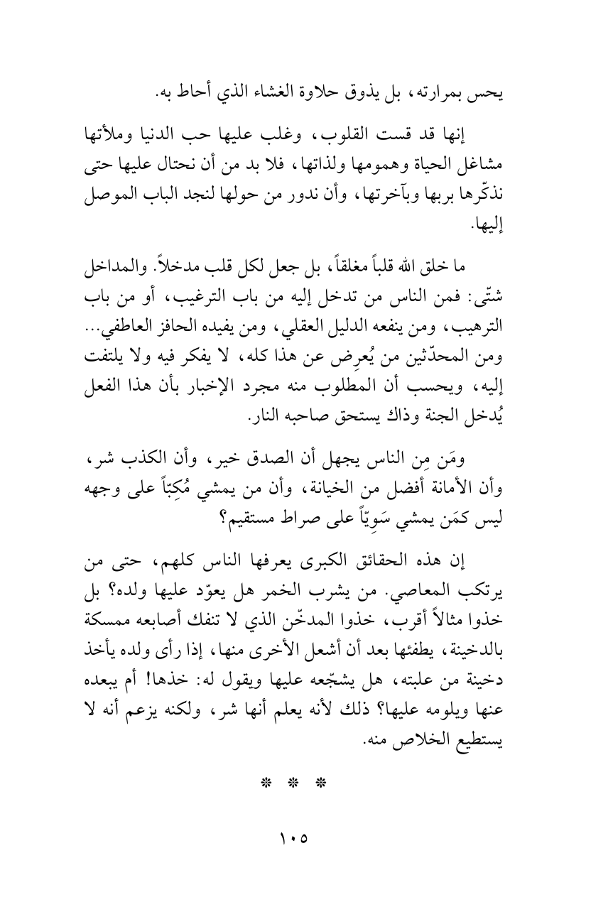 ما خلق الله قلباً مغلقاً، بل جعل لكل قلب مدخلاً. والمداخل شتّى: فمن الناس من تدخل إليه من باب الترغيب، أو من باب الترهيب، ومن ينفعه الدليل العقلي، ومن يفيده الحافز العاطفي ... ومن المحدّثين من يُعرِض عن هذا كله، لا يفكر فيه ولا يلتفت إليه، ويحسب أن المطلوب منه مجرد الإخبار بأن هذا الفعل يُدخل الجنة وذاك يستحق صاحبه النار.