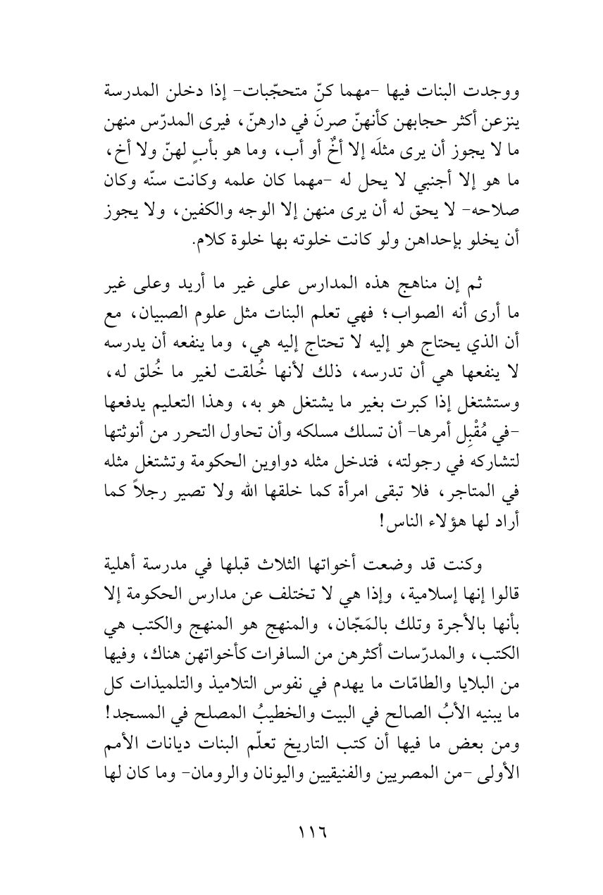 وكنت قد وضعت أخواتها الثلاث قبلها في مدرسة أهلية قالوا إنها إسلامية، وإذا هي لا تختلف عن مدارس الحكومة إلا بأنها بالأجرة وتلك بالمَجّان، والمنهج هو المنهج والكتب هي الكتب، والمدرّسات أكثرهن من السافرات كأخواتهن هناك، وفيها من البلايا والطامّات ما يهدم في نفوس التلاميذ والتلميذات كل ما يبنيه الأبُ الصالح في البيت والخطيبُ المصلح في المسجد! ومن بعض ما فيها أن كتب التاريخ تعلّم البنات ديانات الأمم الأولى -من المصريين والفنيقيين واليونان والرومان- وما كان لها