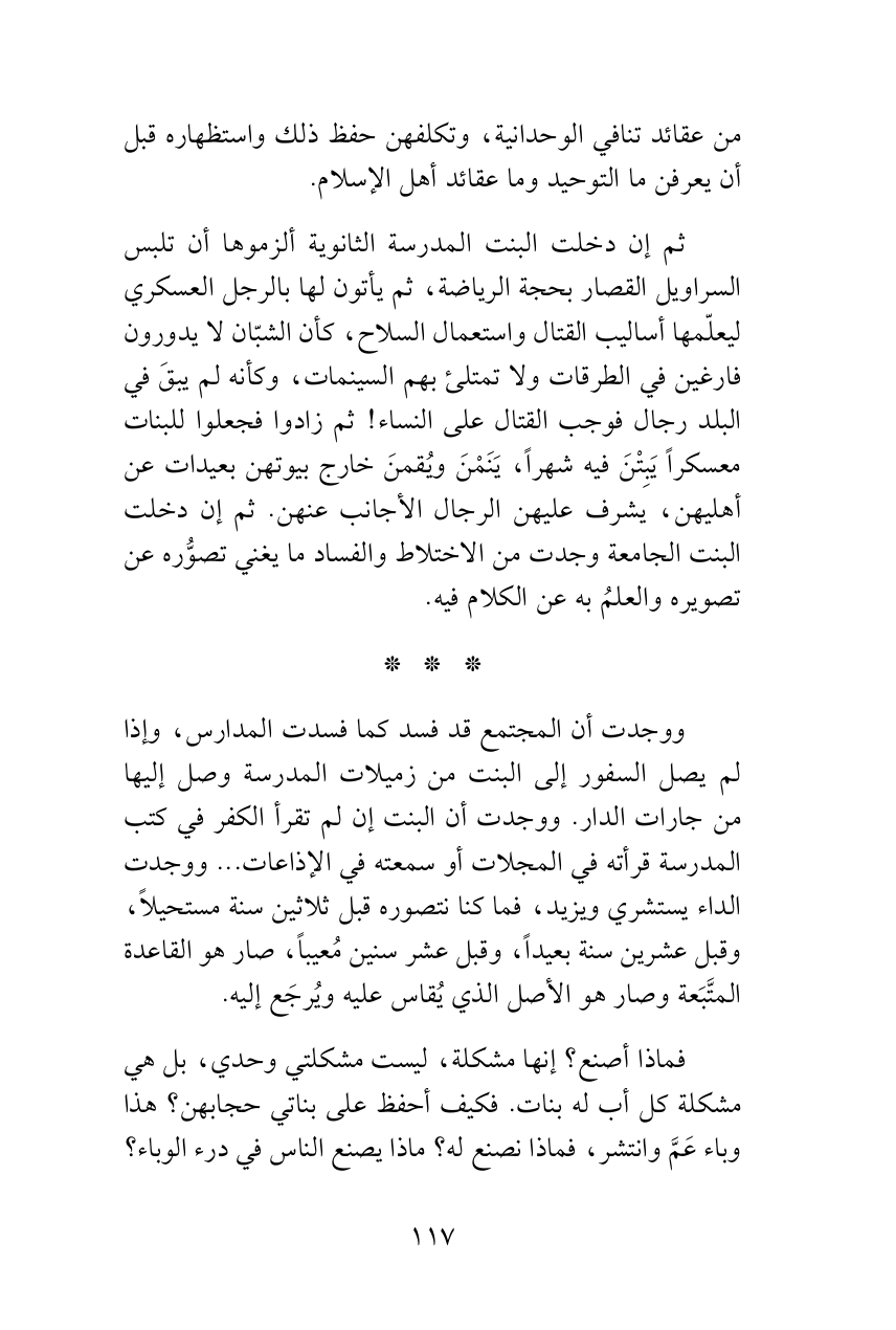 ثم إن دخلت البنت المدرسة الثانوية ألزموها أن تلبس السراويل القصار بحجة الرياضة، ثم يأتون لها بالرجل العسكري ليعلّمها أساليب القتال واستعمال السلاح، كأن الشبّان لا يدورون فارغين في الطرقات ولا تمتلئ بهم السينمات، وكأنه لم يبقَ في البلد رجال فوجب القتال على النساء! ثم زادوا فجعلوا للبنات معسكراً يَبِتْنَ فيه شهراً، يَنَمْنَ ويُقمنَ خارج بيوتهن بعيدات عن أهليهن، يشرف عليهن الرجال الأجانب عنهن. ثم إن دخلت البنت الجامعة وجدت من الاختلاط والفساد ما يغني تصوُّره عن تصويره والعلمُ به عن الكلام فيه.