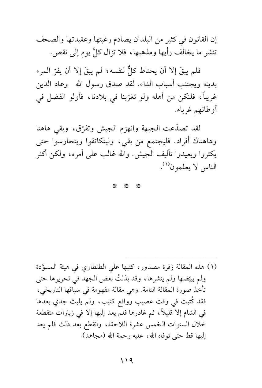 (¬1) هذه المقالة زفرة مصدور، كتبها علي الطنطاوي في هيئة المسوَّدة ولم يبيّضها ولم ينشرها، وقد بذلتُ بعض الجهد في تحريرها حتى تأخذ صورة المقالة التامة. وهي مقالة مفهومة في سياقها التاريخي، فقد كُتبت في وقت عصيب وواقع كئيب، ولم يلبث جدي بعدها في الشام إلا قليلاً، ثم غادرها فلم يعد إليها إلا في زيارات متقطعة خلال السنوات الخمس عشرة اللاحقة، وانقطع بعد ذلك فلم يعد إليها قط حتى توفاه الله، عليه رحمة الله (مجاهد).
