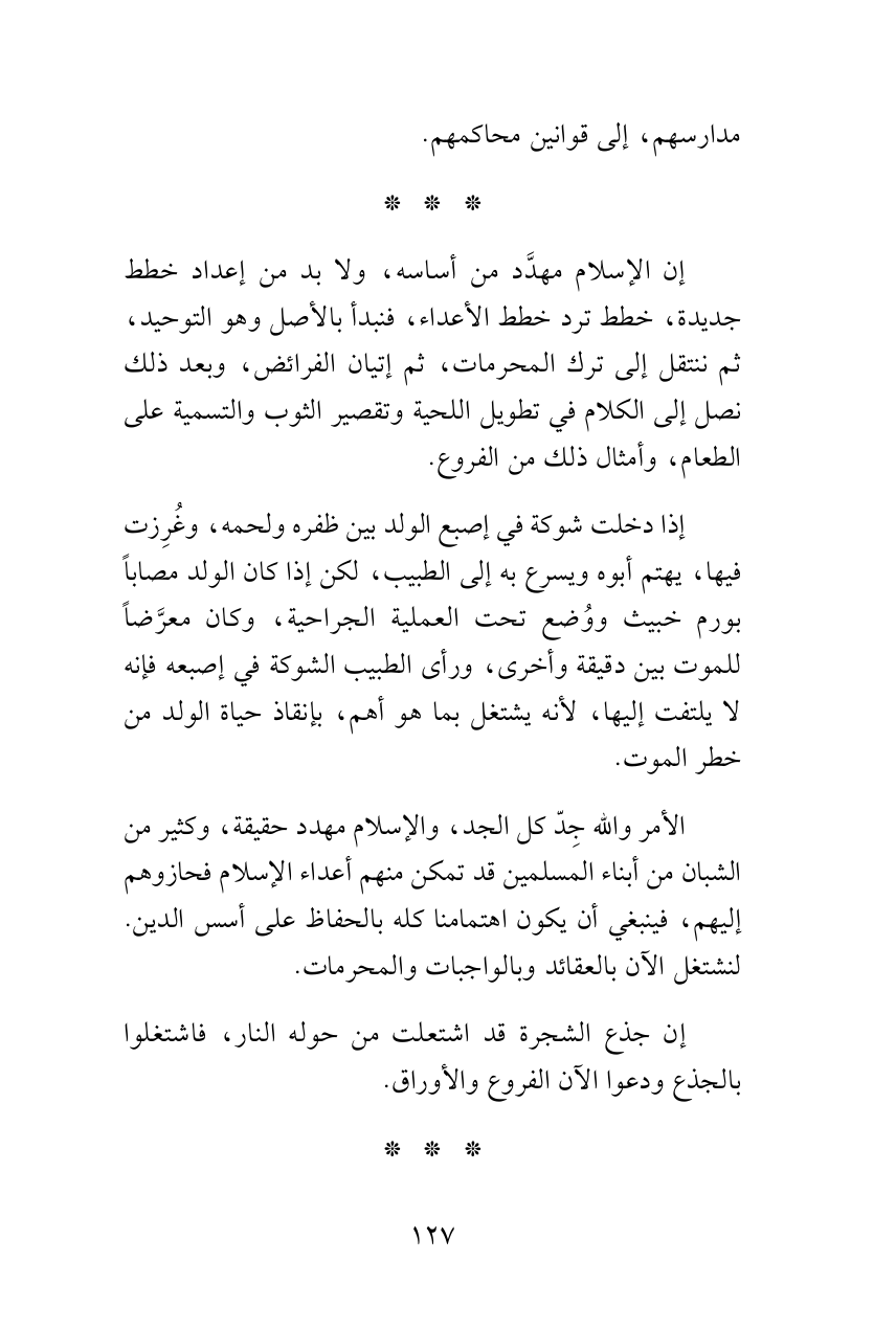 إن الإسلام مهدَّد من أساسه، ولا بد من إعداد خطط جديدة، خطط ترد خطط الأعداء، فنبدأ بالأصل وهو التوحيد، ثم ننتقل إلى ترك المحرمات، ثم إتيان الفرائض، وبعد ذلك نصل إلى الكلام في تطويل اللحية وتقصير الثوب والتسمية على الطعام، وأمثال ذلك من الفروع.
