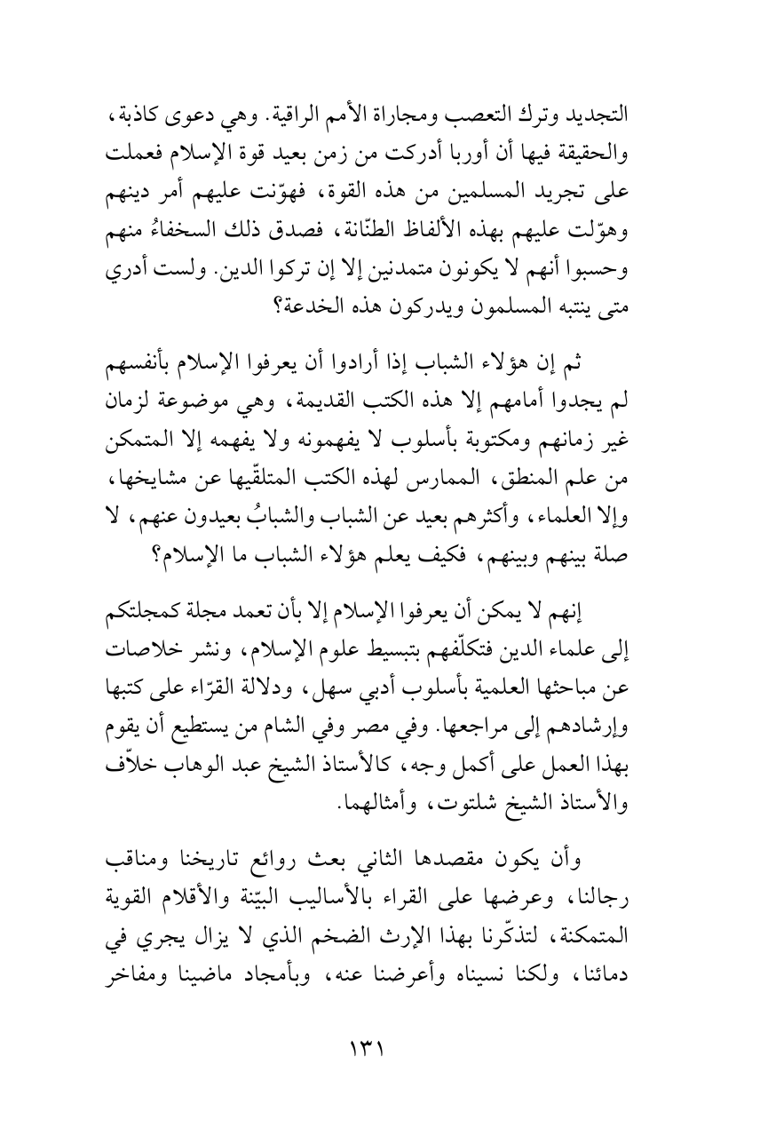 إنهم لا يمكن أن يعرفوا الإسلام إلا بأن تعمد مجلة كمجلتكم إلى علماء الدين فتكلّفهم بتبسيط علوم الإسلام، ونشر خلاصات عن مباحثها العلمية بأسلوب أدبي سهل، ودلالة القرّاء على كتبها وإرشادهم إلى مراجعها. وفي مصر وفي الشام من يستطيع أن يقوم بهذا العمل على أكمل وجه، كالأستاذ الشيخ عبد الوهاب خلاّف والأستاذ الشيخ شلتوت، وأمثالهما.