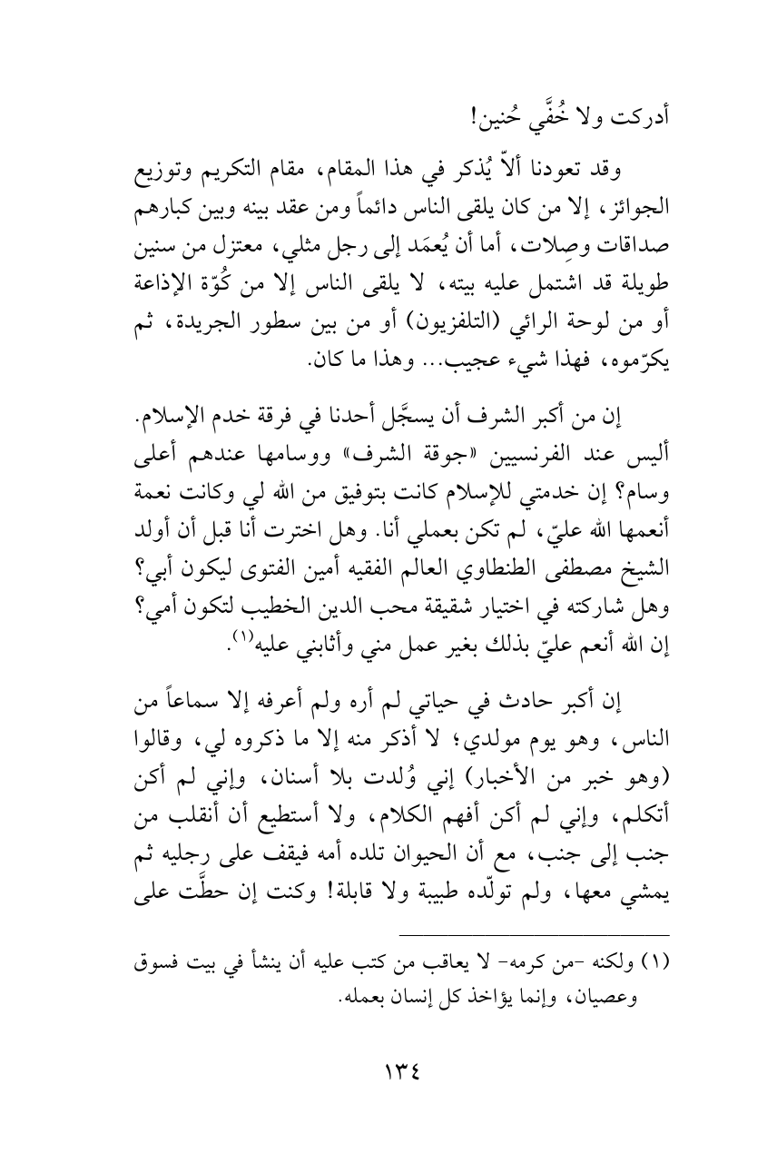 إن من أكبر الشرف أن يسجَّل أحدنا في فرقة خدم الإسلام. أليس عند الفرنسيين «جوقة الشرف» ووسامها عندهم أعلى وسام؟ إن خدمتي للإسلام كانت بتوفيق من الله لي وكانت نعمة أنعمها الله عليّ، لم تكن بعملي أنا. وهل اخترت أنا قبل أن أولد الشيخ مصطفى الطنطاوي العالم الفقيه أمين الفتوى ليكون أبي؟ وهل شاركته في اختيار شقيقة محب الدين الخطيب لتكون أمي؟ إن الله أنعم عليّ بذلك بغير عمل مني وأثابني عليه (¬1).