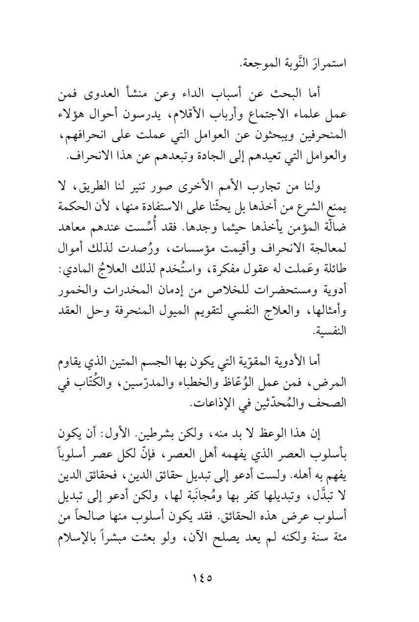 إن هذا الوعظ لا بد منه، ولكن بشرطين. الأول: أن يكون بأسلوب العصر الذي يفهمه أهل العصر، فإنّ لكل عصر أسلوباً يفهم به أهله. ولست أدعو إلى تبديل حقائق الدين، فحقائق الدين لا تبدَّل، وتبديلها كفر بها ومُجانَبة لها، ولكن أدعو إلى تبديل أسلوب عرض هذه الحقائق. فقد يكون أسلوب منها صالحاً من مئة سنة ولكنه لم يعد يصلح الآن، ولو بعثت مبشراً بالإسلام