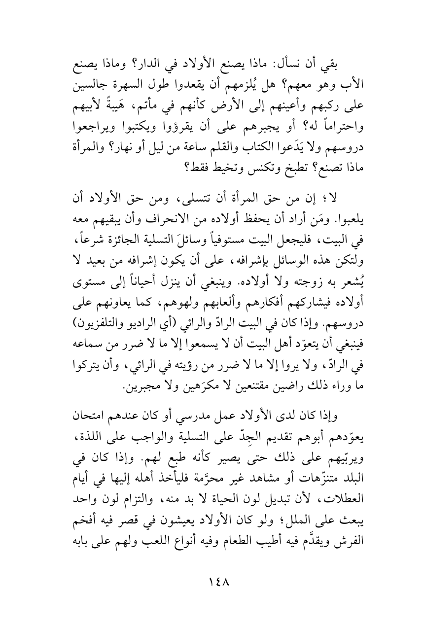 بقي أن نسأل: ماذا يصنع الأولاد في الدار؟ وماذا يصنع الأب وهو معهم؟ هل يُلزمهم أن يقعدوا طول السهرة جالسين على ركبهم وأعينهم إلى الأرض كأنهم في مأتم، هَيبةً لأبيهم واحتراماً له؟ أو يجبرهم على أن يقرؤوا ويكتبوا ويراجعوا دروسهم ولا يَدَعوا الكتاب والقلم ساعة من ليل أو نهار؟ والمرأة ماذا تصنع؟ تطبخ وتكنس وتخيط فقط؟