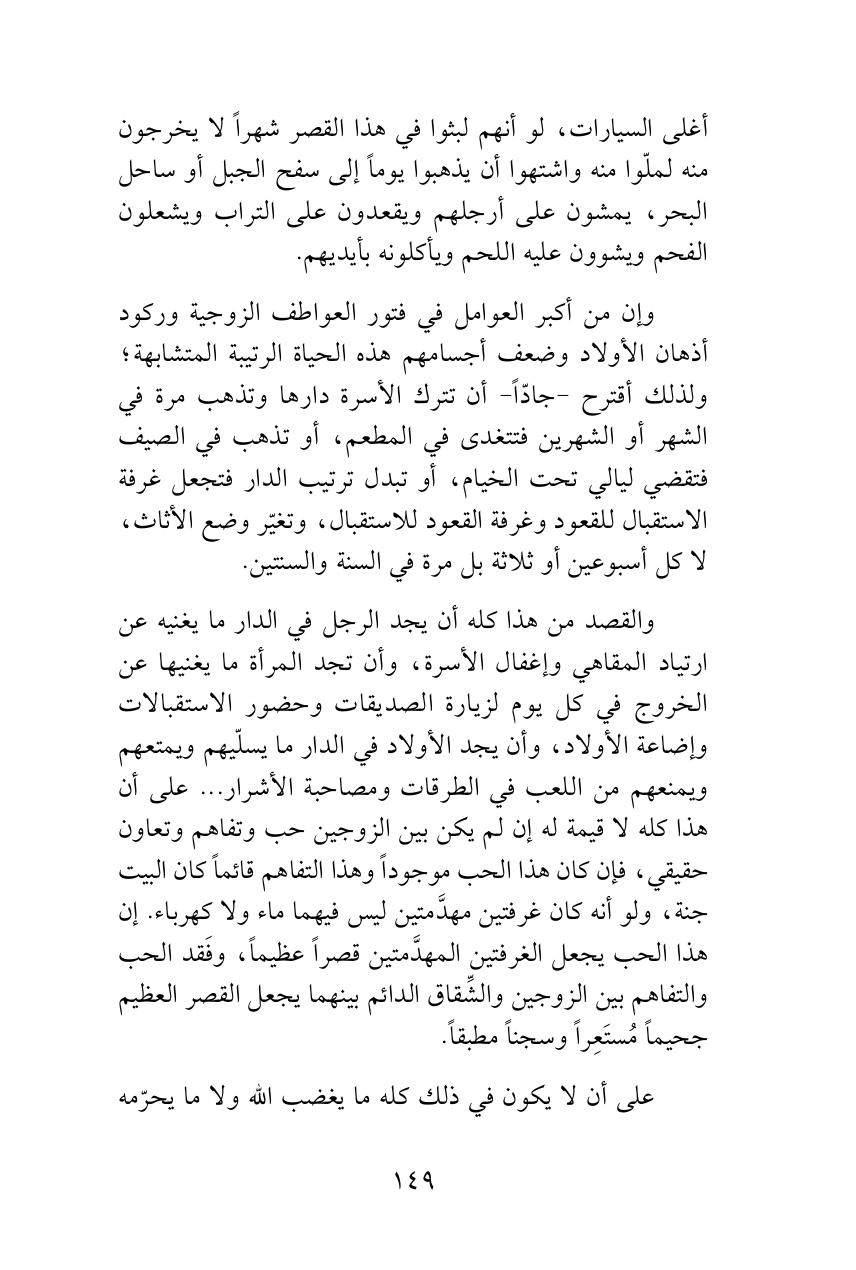 والقصد من هذا كله أن يجد الرجل في الدار ما يغنيه عن ارتياد المقاهي وإغفال الأسرة، وأن تجد المرأة ما يغنيها عن الخروج في كل يوم لزيارة الصديقات وحضور الاستقبالات وإضاعة الأولاد، وأن يجد الأولاد في الدار ما يسلّيهم ويمتعهم ويمنعهم من اللعب في الطرقات ومصاحبة الأشرار ... على أن هذا كله لا قيمة له إن لم يكن بين الزوجين حب وتفاهم وتعاون حقيقي، فإن كان هذا الحب موجوداً وهذا التفاهم قائماً كان البيت جنة، ولو أنه كان غرفتين مهدَّمتين ليس فيهما ماء ولا كهرباء. إن هذا الحب يجعل الغرفتين المهدَّمتين قصراً عظيماً، وفَقد الحب والتفاهم بين الزوجين والشِّقاق الدائم بينهما يجعل القصر العظيم جحيماً مُستَعِراً وسجناً مطبقاً.