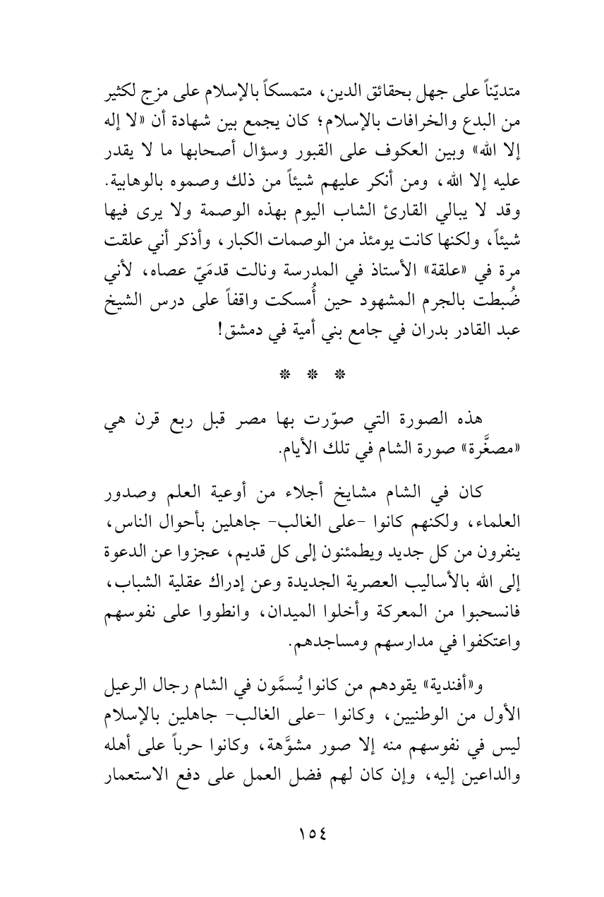 و «أفندية» يقودهم من كانوا يُسمَّون في الشام رجال الرعيل الأول من الوطنيين، وكانوا -على الغالب- جاهلين بالإسلام ليس في نفوسهم منه إلا صور مشوَّهة، وكانوا حرباً على أهله والداعين إليه، وإن كان لهم فضل العمل على دفع الاستعمار