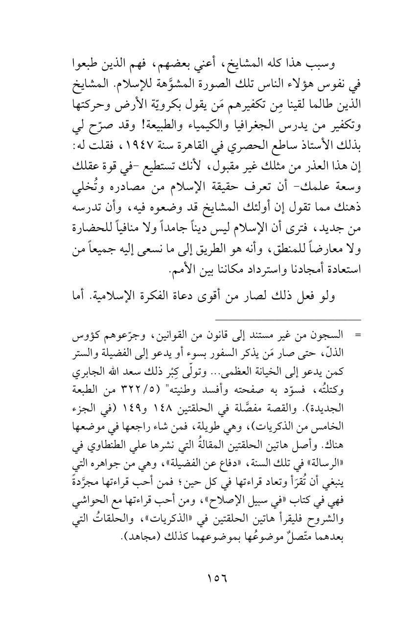 وسبب هذا كله المشايخ، أعني بعضهم، فهم الذين طبعوا في نفوس هؤلاء الناس تلك الصورة المشوَّهة للإسلام. المشايخ الذين طالما لقينا مِن تكفيرهم مَن يقول بكرويّة الأرض وحركتها وتكفير من يدرس الجغرافيا والكيمياء والطبيعة! وقد صرّح لي بذلك الأستاذ ساطع الحصري في القاهرة سنة 1947، فقلت له: إن هذا العذر من مثلك غير مقبول، لأنك تستطيع -في قوة عقلك وسعة علمك- أن تعرف حقيقة الإسلام من مصادره وتُخلي ذهنك مما تقول إن أولئك المشايخ قد وضعوه فيه، وأن تدرسه من جديد، فترى أن الإسلام ليس ديناً جامداً ولا منافياً للحضارة ولا معارضاً للمنطق، وأنه هو الطريق إلى ما نسعى إليه جميعاً من استعادة أمجادنا واسترداد مكاننا بين الأمم.