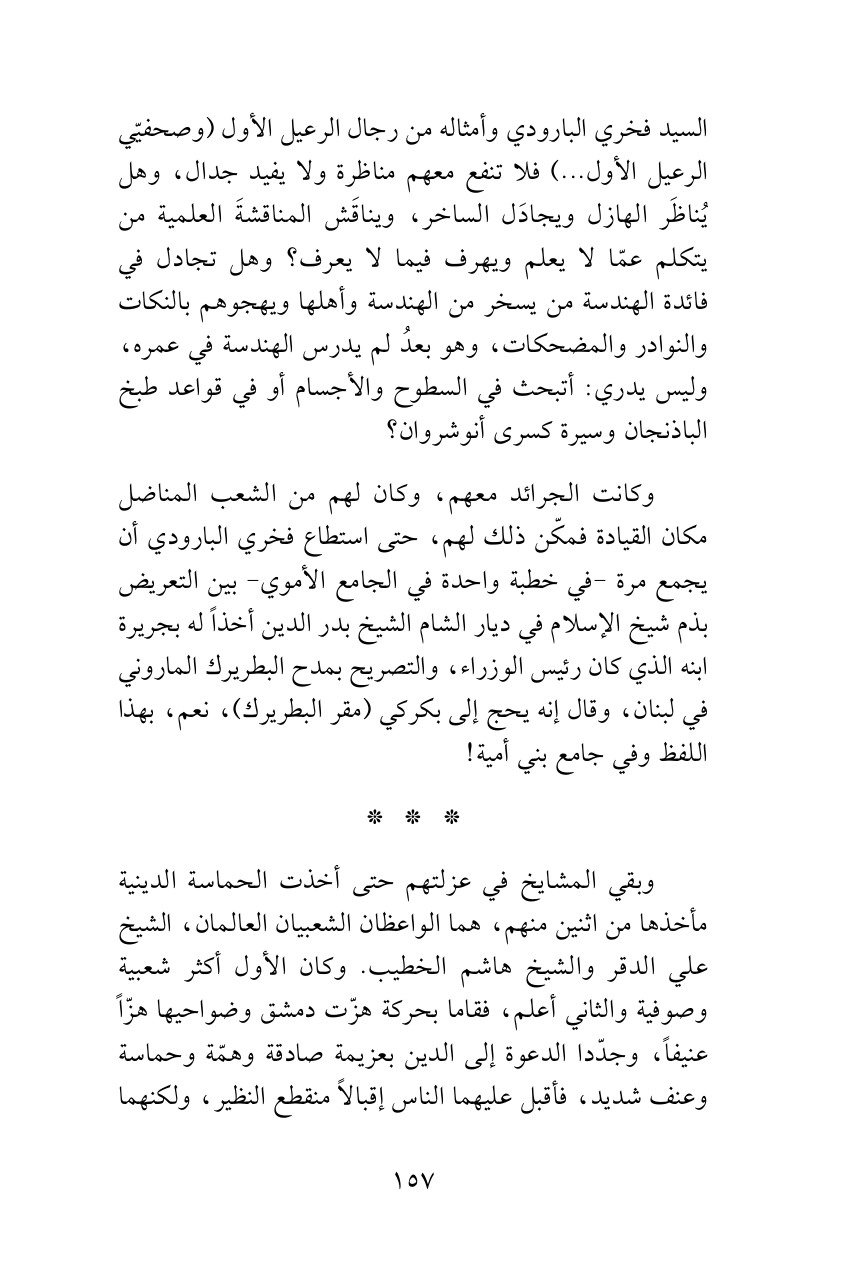 وكانت الجرائد معهم، وكان لهم من الشعب المناضل مكان القيادة فمكّن ذلك لهم، حتى استطاع فخري البارودي أن يجمع مرة -في خطبة واحدة في الجامع الأموي- بين التعريض بذم شيخ الإسلام في ديار الشام الشيخ بدر الدين أخذاً له بجريرة ابنه الذي كان رئيس الوزراء، والتصريح بمدح البطريرك الماروني في لبنان، وقال إنه يحج إلى بكركي (مقر البطريرك)، نعم، بهذا اللفظ وفي جامع بني أمية!