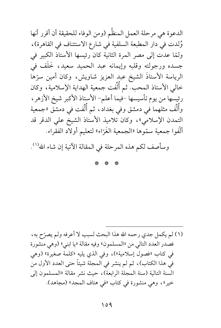 (¬1) لم يكمل جدي رحمه الله هذا البحث لسبب لا أعرفه ولم يصرّح به، فصدر العدد التالي من «المسلمون» وفيه مقالة «يا ابني» (وهي منشورة في كتاب «فصول إسلامية»)، وفي الذي يليه «كلمة صغيرة» (وهي في هذا الكتاب)، ثم لم ينشر في المجلة شيئاً حتى العدد الأول من السنة التالية (سنة المجلة الرابعة)، حيث نشر مقالة «المسلمون إلى خير»، وهي منشورة في كتاب «في هتاف المجد» (مجاهد).