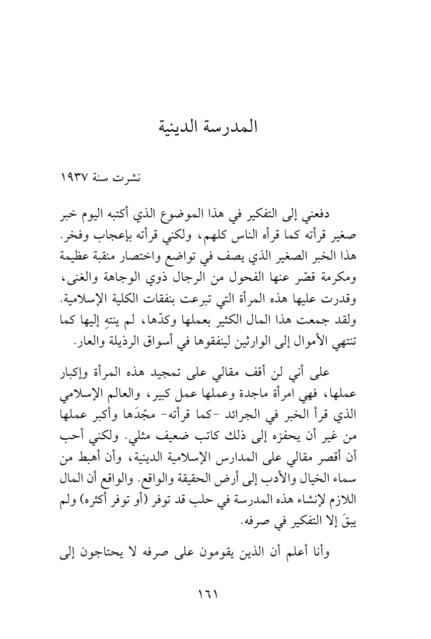على أني لن أقف مقالي على تمجيد هذه المرأة وإكبار عملها، فهي امرأة ماجدة وعملها عمل كبير، والعالم الإسلامي الذي قرأ الخبر في الجرائد -كما قرأته- مجّدَها وأكبر عملها من غير أن يحفزه إلى ذلك كاتب ضعيف مثلي. ولكني أحب أن أقصر مقالي على المدارس الإسلامية الدينية، وأن أهبط من سماء الخيال والأدب إلى أرض الحقيقة والواقع. والواقع أن المال اللازم لإنشاء هذه المدرسة في حلب قد توفر (أو توفر أكثره) ولم يبقَ إلا التفكير في صرفه.