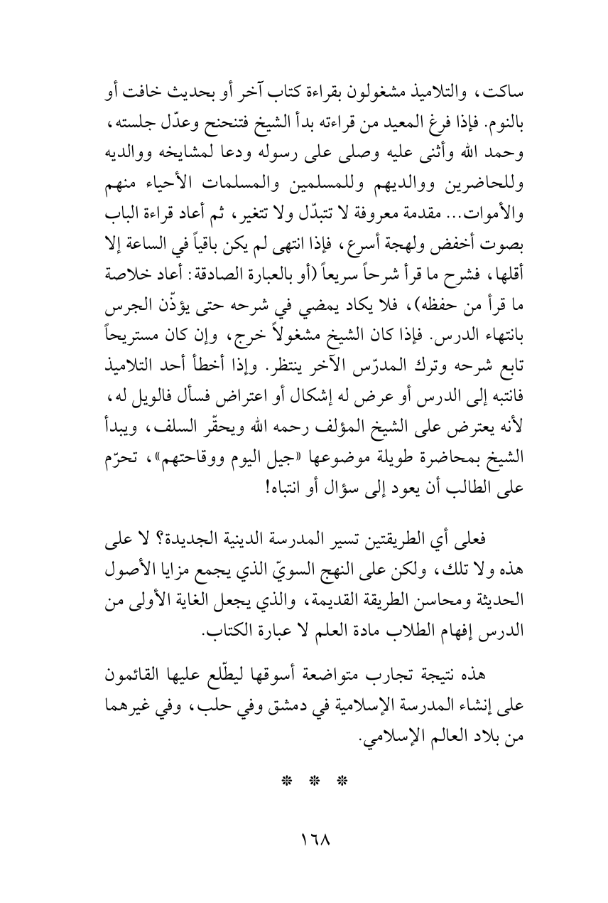 ساكت، والتلاميذ مشغولون بقراءة كتاب آخر أو بحديث خافت أو بالنوم. فإذا فرغ المعيد من قراءته بدأ الشيخ فتنحنح وعدّل جلسته، وحمد الله وأثنى عليه وصلى على رسوله ودعا لمشايخه ووالديه وللحاضرين ووالديهم وللمسلمين والمسلمات الأحياء منهم والأموات ... مقدمة معروفة لا تتبدّل ولا تتغير، ثم أعاد قراءة الباب بصوت أخفض ولهجة أسرع، فإذا انتهى لم يكن باقياً في الساعة إلا أقلها، فشرح ما قرأ شرحاً سريعاً (أو بالعبارة الصادقة: أعاد خلاصة ما قرأ من حفظه)، فلا يكاد يمضي في شرحه حتى يؤذّن الجرس بانتهاء الدرس. فإذا كان الشيخ مشغولاً خرج، وإن كان مستريحاً تابع شرحه وترك المدرّس الآخر ينتظر. وإذا أخطأ أحد التلاميذ فانتبه إلى الدرس أو عرض له إشكال أو اعتراض فسأل فالويل له، لأنه يعترض على الشيخ المؤلف رحمه الله ويحقّر السلف، ويبدأ الشيخ بمحاضرة طويلة موضوعها «جيل اليوم ووقاحتهم»، تحرّم على الطالب أن يعود إلى سؤال أو انتباه!