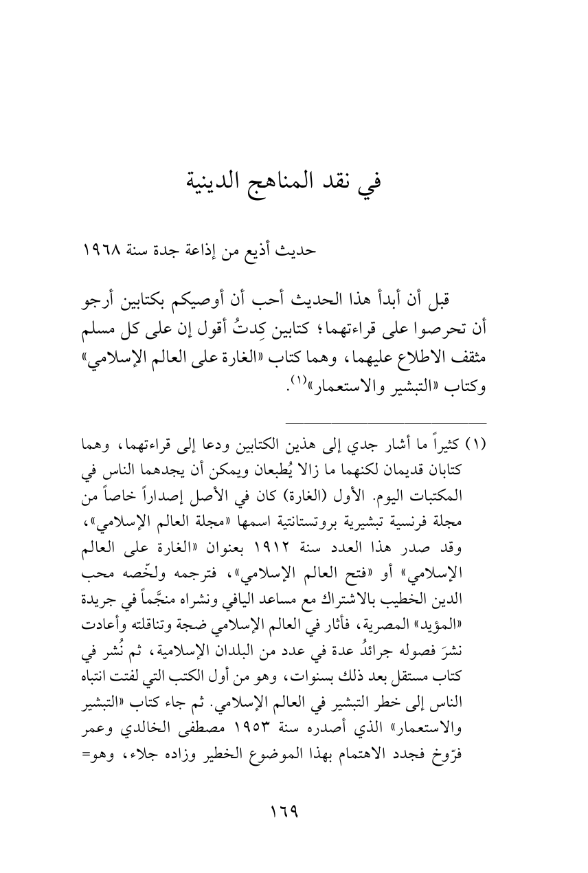 (¬1) كثيراً ما أشار جدي إلى هذين الكتابين ودعا إلى قراءتهما، وهما كتابان قديمان لكنهما ما زالا يُطبعان ويمكن أن يجدهما الناس في المكتبات اليوم. الأول (الغارة) كان في الأصل إصداراً خاصاً من مجلة فرنسية تبشيرية بروتستانتية اسمها «مجلة العالم الإسلامي»، وقد صدر هذا العدد سنة 1912 بعنوان «الغارة على العالم الإسلامي» أو «فتح العالم الإسلامي»، فترجمه ولخّصه محب الدين الخطيب بالاشتراك مع مساعد اليافي ونشراه منجَّماً في جريدة «المؤيد» المصرية، فأثار في العالم الإسلامي ضجة وتناقلته وأعادت نشرَ فصوله جرائدُ عدة في عدد من البلدان الإسلامية، ثم نُشر في كتاب مستقل بعد ذلك بسنوات، وهو من أول الكتب التي لفتت انتباه الناس إلى خطر التبشير في العالم الإسلامي. ثم جاء كتاب «التبشير والاستعمار» الذي أصدره سنة 1953 مصطفى الخالدي وعمر فرّوخ فجدد الاهتمام بهذا الموضوع الخطير وزاده جلاء، وهو=