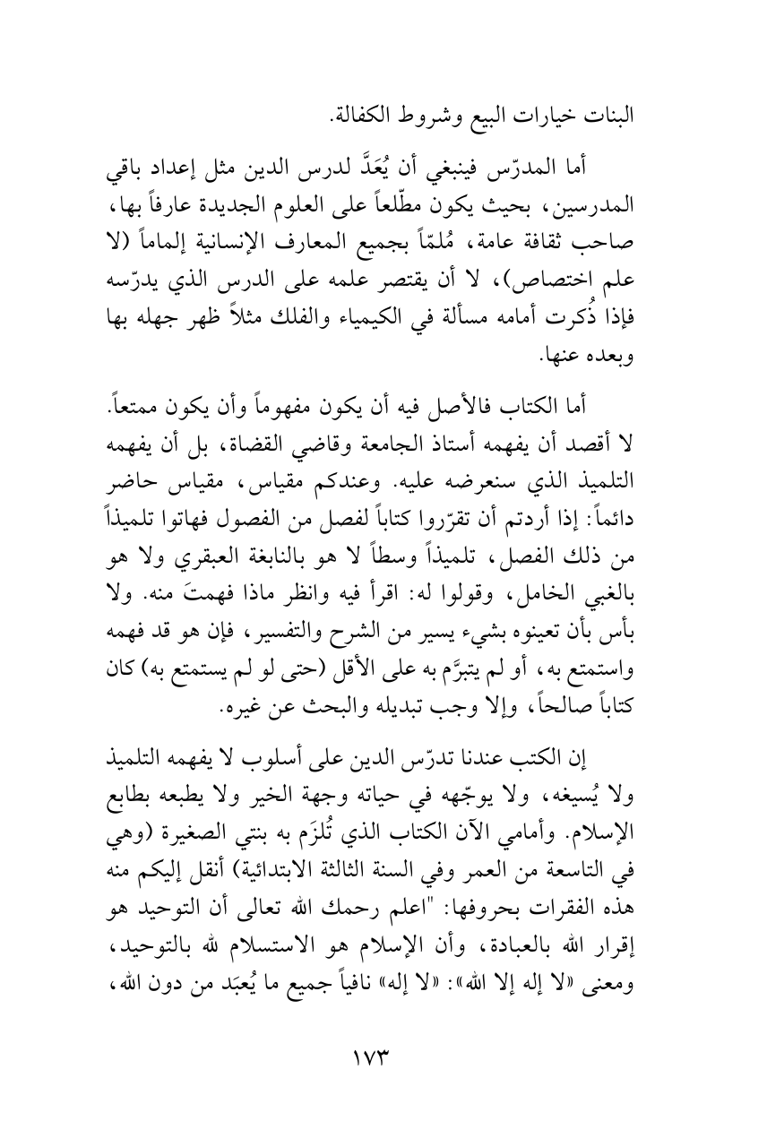 إن الكتب عندنا تدرّس الدين على أسلوب لا يفهمه التلميذ ولا يُسيغه، ولا يوجّهه في حياته وجهة الخير ولا يطبعه بطابع الإسلام. وأمامي الآن الكتاب الذي تُلزَم به بنتي الصغيرة (وهي في التاسعة من العمر وفي السنة الثالثة الابتدائية) أنقل إليكم منه هذه الفقرات بحروفها: "اعلم رحمك الله تعالى أن التوحيد هو إقرار الله بالعبادة، وأن الإسلام هو الاستسلام لله بالتوحيد، ومعنى «لا إله إلا الله»: «لا إله» نافياً جميع ما يُعبَد من دون الله،