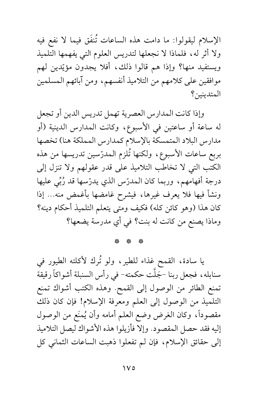 يا سادة، القمح غذاء للطير، ولو تُرك لأكلته الطيور في سنابله، فجعل ربنا -جَلَّت حكمته- في رأس السنبلة أشواكاً رقيقة تمنع الطائر من الوصول إلى القمح. وهذه الكتب أشواك تمنع التلميذ من الوصول إلى العلم ومعرفة الإسلام! فإن كان ذلك مقصوداً، وكان الغرض وضع العلم أمامه وأن يُمنَع من الوصول إليه فقد حصل المقصود. وإلا فأزيلوا هذه الأشواك ليصل التلاميذ إلى حقائق الإسلام، فإن لم تفعلوا ذهبت الساعات الثماني كل