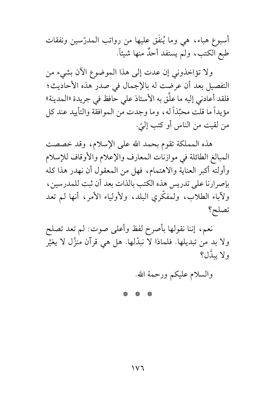 هذه المملكة تقوم بحمد الله على الإسلام، وقد خصصت المبالغ الطائلة في موازنات المعارف والإعلام والأوقاف للإسلام وأولته أكبر العناية والاهتمام، فهل من المعقول أن نهدر هذا كله بإصرارنا على تدريس هذه الكتب بالذات بعد أن ثبت للمدرسين، ولآباء الطلاب، ولمفكّري البلد، ولأولياء الأمر، أنها لم تعد تصلح؟