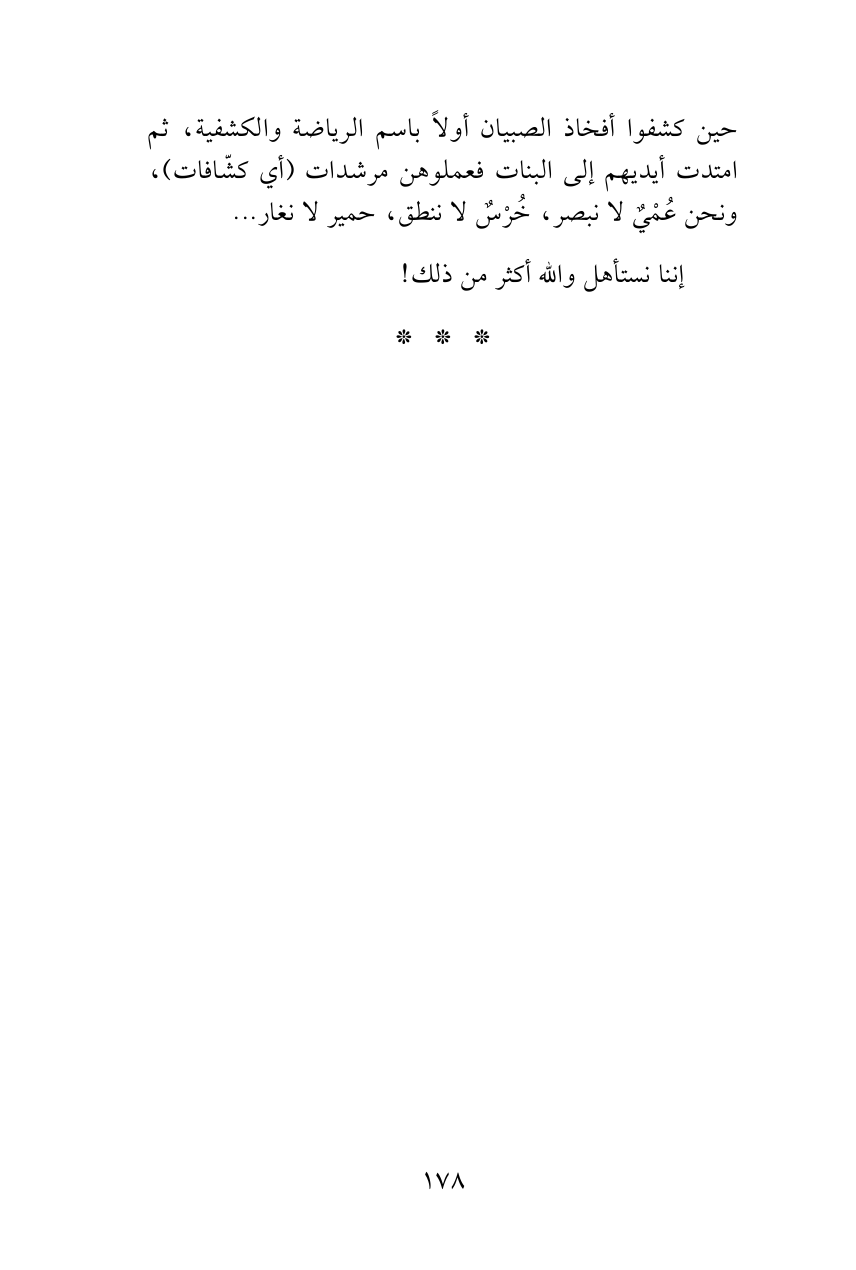 حين كشفوا أفخاذ الصبيان أولاً باسم الرياضة والكشفية، ثم امتدت أيديهم إلى البنات فعملوهن مرشدات (أي كشّافات)، ونحن عُمْيٌ لا نبصر، خُرْسٌ لا ننطق، حمير لا نغار ...