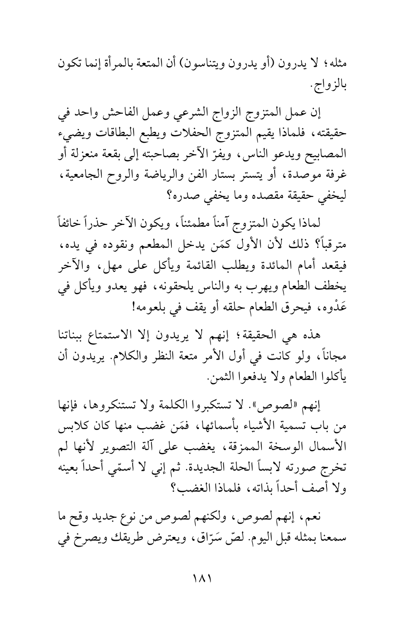 لماذا يكون المتزوج آمناً مطمئناً، ويكون الآخر حذراً خائفاً مترقباً؟ ذلك لأن الأول كمَن يدخل المطعم ونقوده في يده، فيقعد أمام المائدة ويطلب القائمة ويأكل على مهل، والآخر يخطف الطعام ويهرب به والناس يلحقونه، فهو يعدو ويأكل في عَدْوه، فيحرق الطعام حلقه أو يقف في بلعومه!
