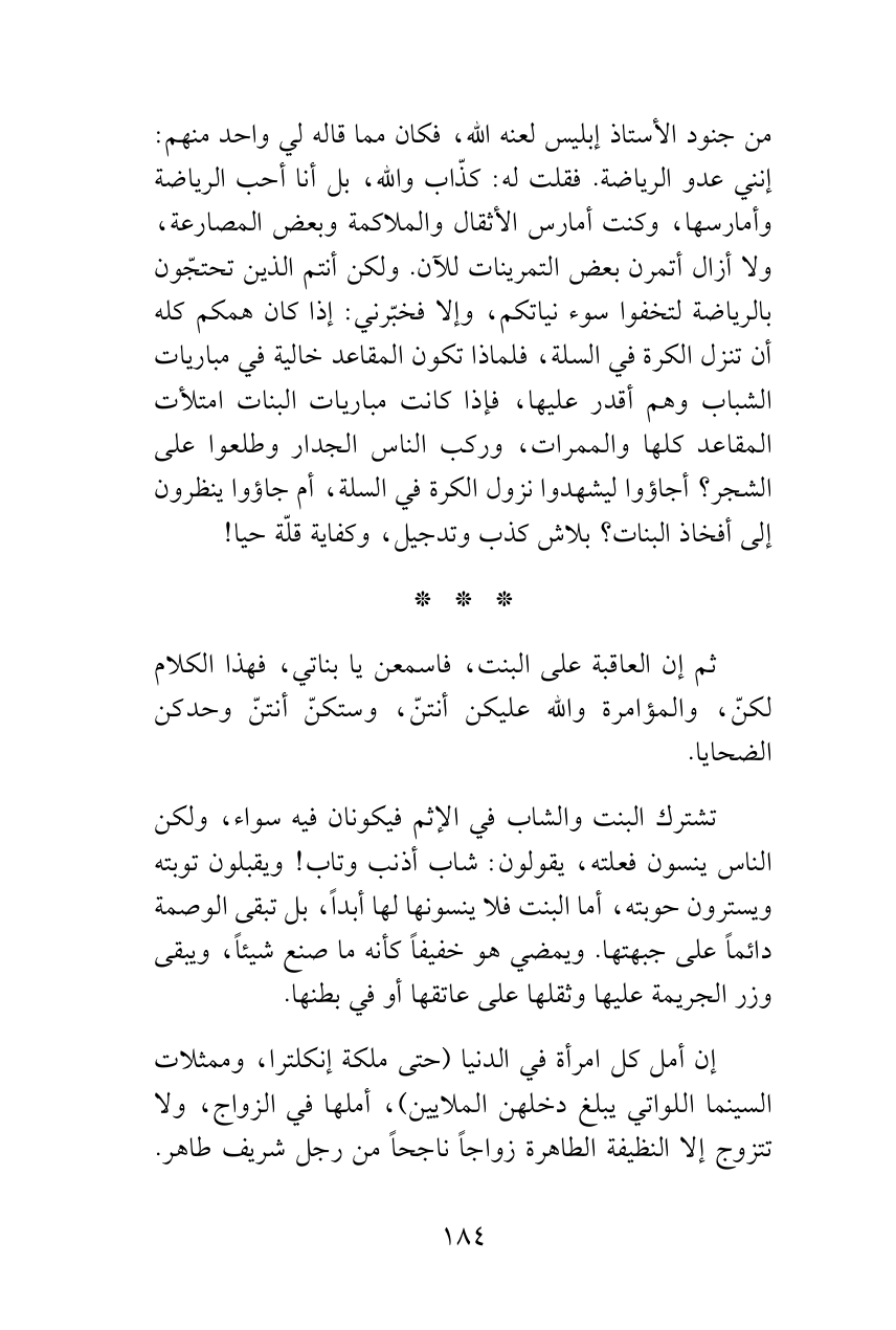 من جنود الأستاذ إبليس لعنه الله، فكان مما قاله لي واحد منهم: إنني عدو الرياضة. فقلت له: كذّاب والله، بل أنا أحب الرياضة وأمارسها، وكنت أمارس الأثقال والملاكمة وبعض المصارعة، ولا أزال أتمرن بعض التمرينات للآن. ولكن أنتم الذين تحتجّون بالرياضة لتخفوا سوء نياتكم، وإلا فخبّرني: إذا كان همكم كله أن تنزل الكرة في السلة، فلماذا تكون المقاعد خالية في مباريات الشباب وهم أقدر عليها، فإذا كانت مباريات البنات امتلأت المقاعد كلها والممرات، وركب الناس الجدار وطلعوا على الشجر؟ أجاؤوا ليشهدوا نزول الكرة في السلة، أم جاؤوا ينظرون إلى أفخاذ البنات؟ بلاش كذب وتدجيل، وكفاية قلّة حيا!