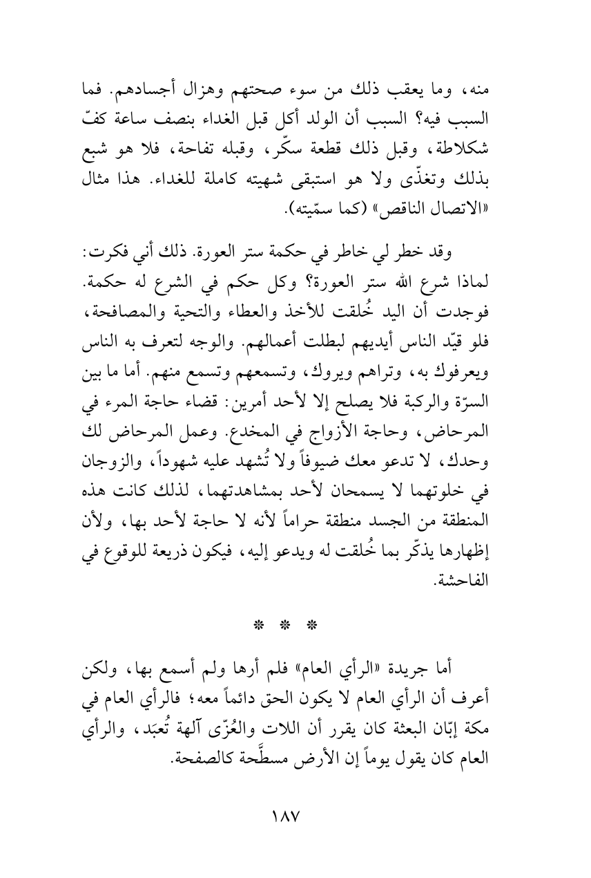 وقد خطر لي خاطر في حكمة ستر العورة. ذلك أني فكرت: لماذا شرع الله ستر العورة؟ وكل حكم في الشرع له حكمة. فوجدت أن اليد خُلقت للأخذ والعطاء والتحية والمصافحة، فلو قيّد الناس أيديهم لبطلت أعمالهم. والوجه لتعرف به الناس ويعرفوك به، وتراهم ويروك، وتسمعهم وتسمع منهم. أما ما بين السرّة والركبة فلا يصلح إلا لأحد أمرين: قضاء حاجة المرء في المرحاض، وحاجة الأزواج في المخدع. وعمل المرحاض لك وحدك، لا تدعو معك ضيوفاً ولا تُشهد عليه شهوداً، والزوجان في خلوتهما لا يسمحان لأحد بمشاهدتهما، لذلك كانت هذه المنطقة من الجسد منطقة حراماً لأنه لا حاجة لأحد بها، ولأن إظهارها يذكّر بما خُلقت له ويدعو إليه، فيكون ذريعة للوقوع في الفاحشة.