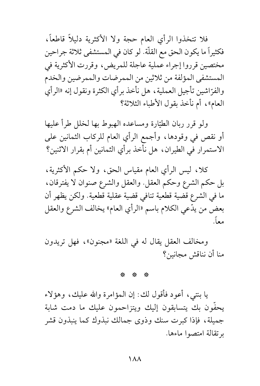 فلا تتخذوا الرأي العام حجة ولا الأكثرية دليلاً قاطعاً، فكثيراً ما يكون الحق مع القلّة. لو كان في المستشفى ثلاثة جراحين مختصين قرروا إجراء عملية عاجلة للمريض، وقررت الأكثرية في المستشفى المؤلفة من ثلاثين من الممرضات والممرضين والخدم والفرّاشين تأجيل العملية، هل نأخذ برأي الكثرة ونقول إنه «الرأي العام»، أم نأخذ بقول الأطباء الثلاثة؟