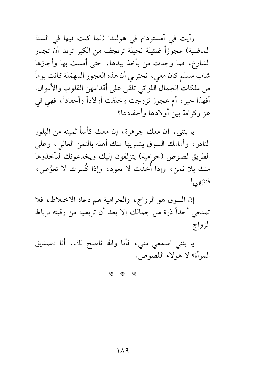 إن السوق هو الزواج، والحرامية هم دعاة الاختلاط، فلا تمنحي أحداً ذرة من جمالك إلا بعد أن تربطيه من رقبته برباط الزواج.