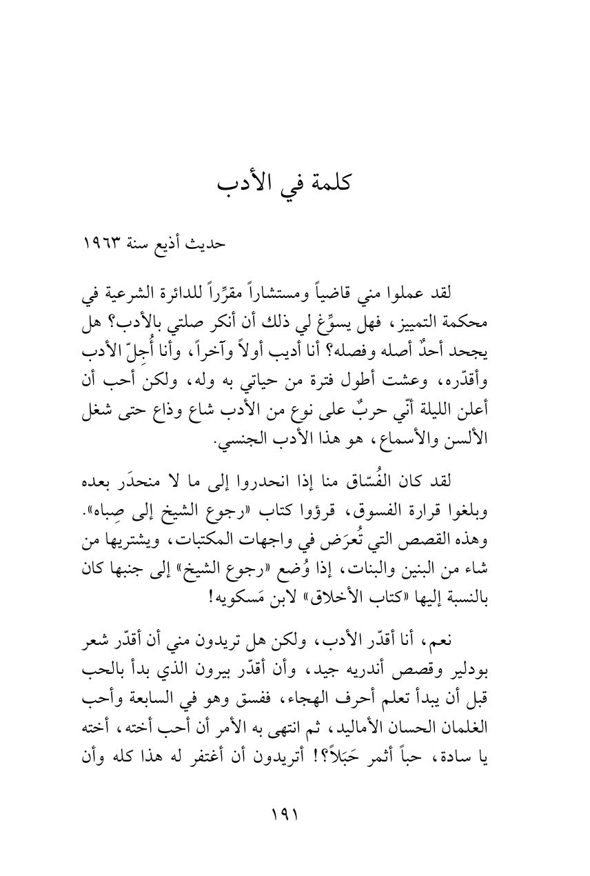 لقد عملوا مني قاضياً ومستشاراً مقرِّراً للدائرة الشرعية في محكمة التمييز، فهل يسوِّغ لي ذلك أن أنكر صلتي بالأدب؟ هل يجحد أحدٌ أصله وفصله؟ أنا أديب أولاً وآخراً، وأنا أُجِلّ الأدب وأقدّره، وعشت أطول فترة من حياتي به وله، ولكن أحب أن أعلن الليلة أنّي حربٌ على نوع من الأدب شاع وذاع حتى شغل الألسن والأسماع، هو هذا الأدب الجنسي.