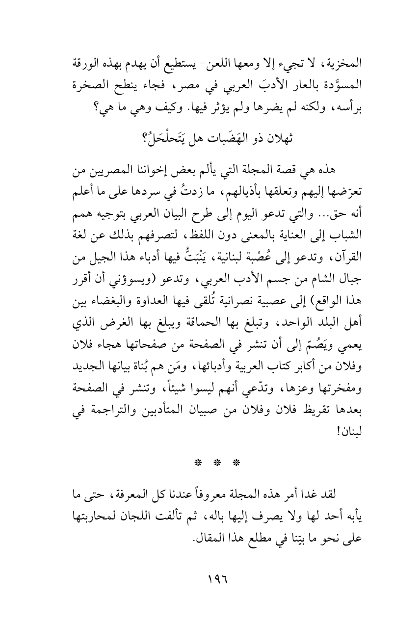 هذه هي قصة المجلة التي يألم بعض إخواننا المصريين من تعرّضها إليهم وتعلقها بأذيالهم، ما زدتُ في سردها على ما أعلم أنه حق ... والتي تدعو اليوم إلى طرح البيان العربي بتوجيه همم الشباب إلى العناية بالمعنى دون اللفظ، لتصرفهم بذلك عن لغة القرآن، وتدعو إلى عُصْبة لبنانية، يَنْبَتُّ فيها أدباء هذا الجيل من جبال الشام من جسم الأدب العربي، وتدعو (ويسوؤني أن أقرر هذا الواقع) إلى عصبية نصرانية تُلقى فيها العداوة والبغضاء بين أهل البلد الواحد، وتبلغ بها الحماقة ويبلغ بها الغرض الذي يعمي ويَصُمّ إلى أن تنشر في الصفحة من صفحاتها هجاء فلان وفلان من أكابر كتاب العربية وأدبائها، ومَن هم بُناة بيانها الجديد ومفخرتها وعزها، وتدّعي أنهم ليسوا شيئاً، وتنشر في الصفحة بعدها تقريظ فلان وفلان من صبيان المتأدبين والتراجمة في لبنان!