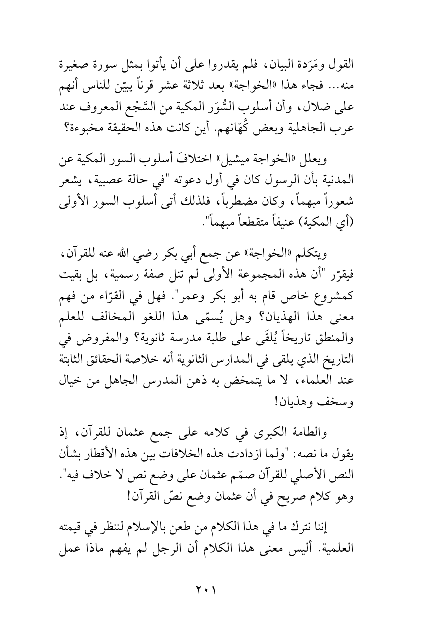 والطامة الكبرى في كلامه على جمع عثمان للقرآن، إذ يقول ما نصه: "ولما ازدادت هذه الخلافات بين هذه الأقطار بشأن النص الأصلي للقرآن صمّم عثمان على وضع نص لا خلاف فيه". وهو كلام صريح في أن عثمان وضع نصّ القرآن!