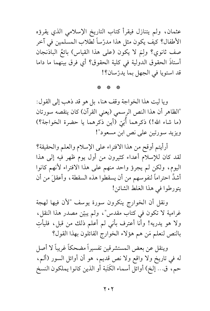 عثمان، ولم يتنازل فيقرأ كتاب التاريخ الإسلامي الذي يقرؤه الأطفال؟ كيف يكون مثل هذا مدرّساً لطلاب المسلمين في آخر صف ثانوي؟ ولِمَ لا يكون (على هذا القياس) بائعُ الباذنجان أستاذَ الحقوق الدولية في كلية الحقوق؟ أي فرق بينهما ما داما قد استويا في الجهل بما يدرّسان؟!