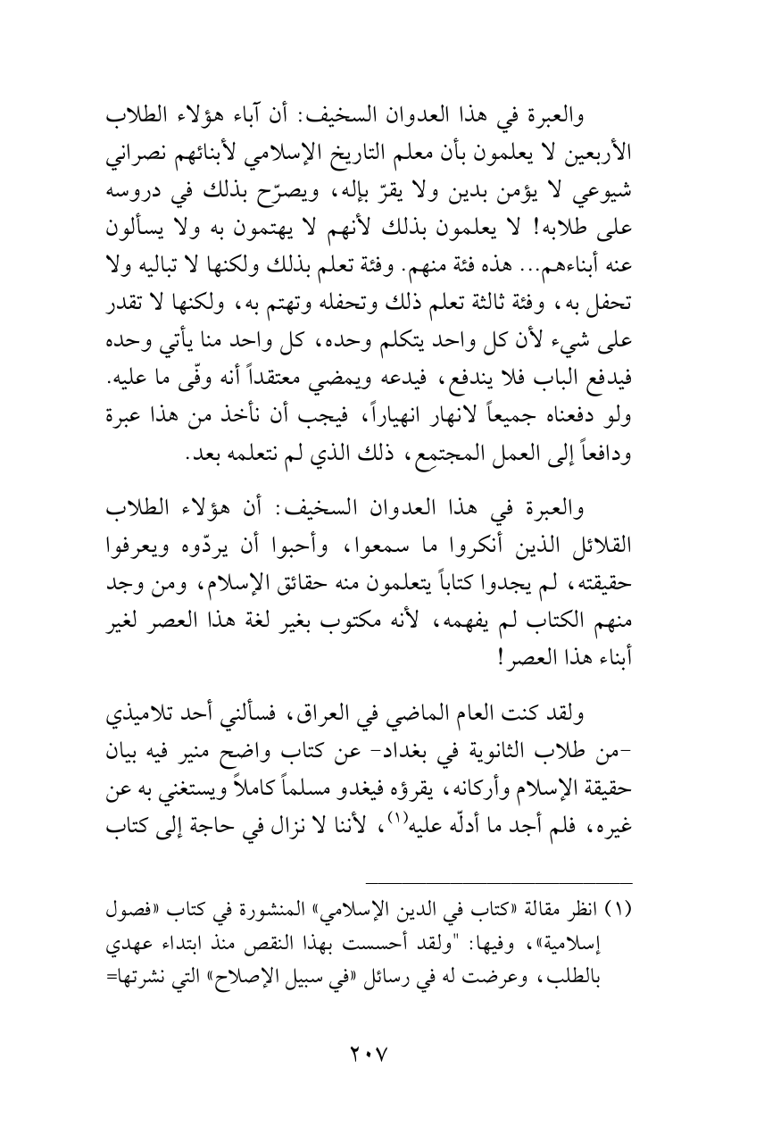 ولقد كنت العام الماضي في العراق، فسألني أحد تلاميذي -من طلاب الثانوية في بغداد- عن كتاب واضح منير فيه بيان حقيقة الإسلام وأركانه، يقرؤه فيغدو مسلماً كاملاً ويستغني به عن غيره، فلم أجد ما أدلّه عليه (¬1)، لأننا لا نزال في حاجة إلى كتاب