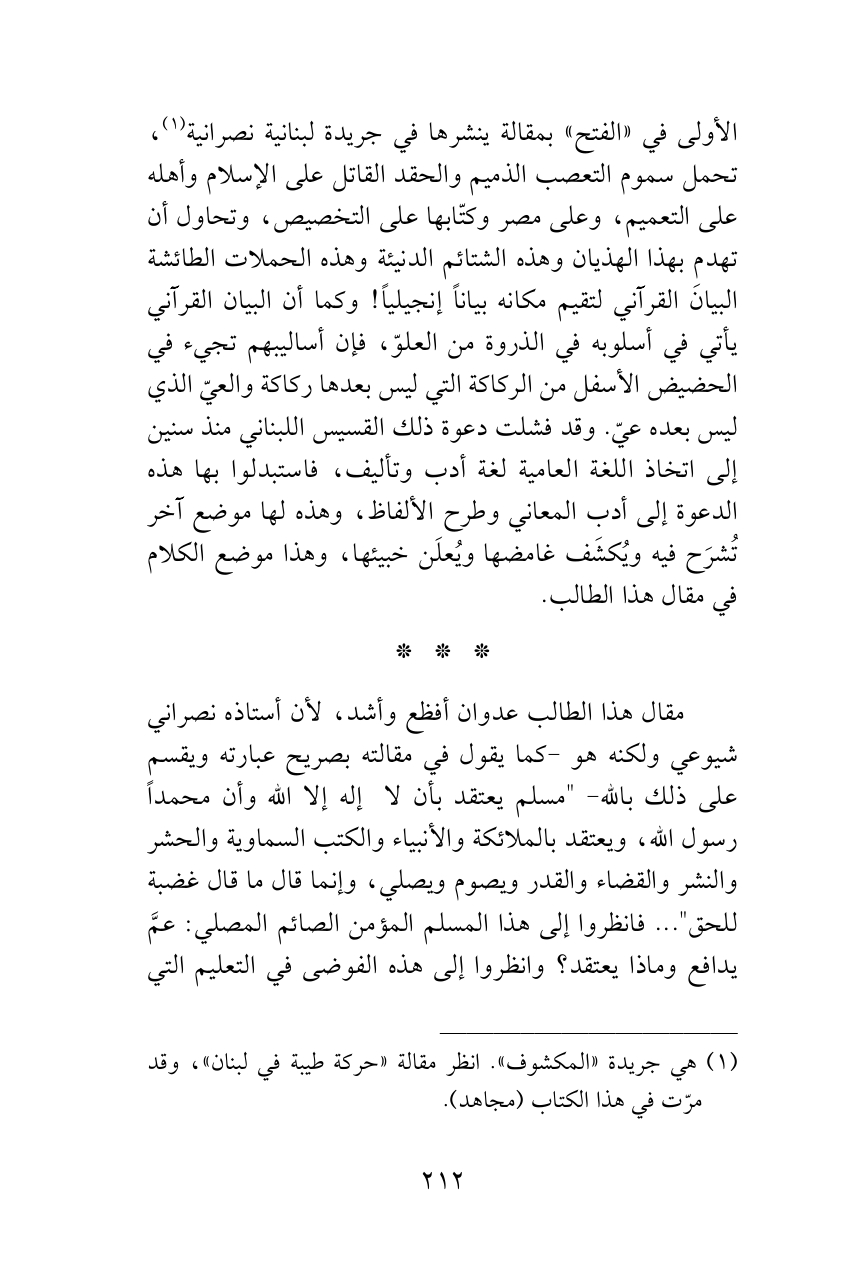 الأولى في «الفتح» بمقالة ينشرها في جريدة لبنانية نصرانية (¬1)، تحمل سموم التعصب الذميم والحقد القاتل على الإسلام وأهله على التعميم، وعلى مصر وكتّابها على التخصيص، وتحاول أن تهدم بهذا الهذيان وهذه الشتائم الدنيئة وهذه الحملات الطائشة البيانَ القرآني لتقيم مكانه بياناً إنجيلياً! وكما أن البيان القرآني يأتي في أسلوبه في الذروة من العلوّ، فإن أساليبهم تجيء في الحضيض الأسفل من الركاكة التي ليس بعدها ركاكة والعيّ الذي ليس بعده عيّ. وقد فشلت دعوة ذلك القسيس اللبناني منذ سنين إلى اتخاذ اللغة العامية لغة أدب وتأليف، فاستبدلوا بها هذه الدعوة إلى أدب المعاني وطرح الألفاظ، وهذه لها موضع آخر تُشرَح فيه ويُكشَف غامضها ويُعلَن خبيئها، وهذا موضع الكلام في مقال هذا الطالب.