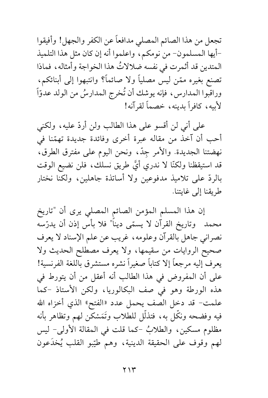 إن هذا المسلم المؤمن الصائم المصلي يرى أن "تاريخ محمد صلى الله عليه وسلم وتاريخ القرآن لا يسمّى ديناً" فلا بأس إذن أن يدرّسه نصراني جاهل بالقرآن وعلومه، غريب عن علم الإسناد لا يعرف صحيح الروايات من سقيمها، ولا يعرف مصطلح الحديث ولا يعرف إليه مرجعاً إلا كتاباً صغيراً نشره مستشرق باللغة الفرنسية! على أن المفروض في هذا الطالب أنه أعقل من أن يتورط في هذه الورطة وهو في صف البكالوريا، ولكن الأستاذ -كما علمت- قد دخل الصف يحمل عدد «الفتح» الذي أخزاه الله فيه وفضحه ونكّل به، فتذلّل للطلاب وتَمَسْكن لهم وتظاهر بأنه مظلوم مسكين، والطلابُ -كما قلت في المقالة الأولى- ليس لهم وقوف على الحقيقة الدينية، وهم طيّبو القلب يُخدَعون