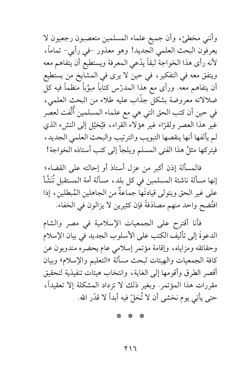 فالمسألة إذن أكبر من عزل أستاذ أو إحالته على القضاء؛ إنها مسألة ناشئة المسلمين في كل بلد، مسألة أمة المستقبل تُنَشَّأ على غير الحق ويتولى قيادتَها جماعةٌ من الجاهلين المُبطلين، إذا افتُضح واحد منهم مصادَفةً فإن كثيرين لا يزالون في الخفاء.
